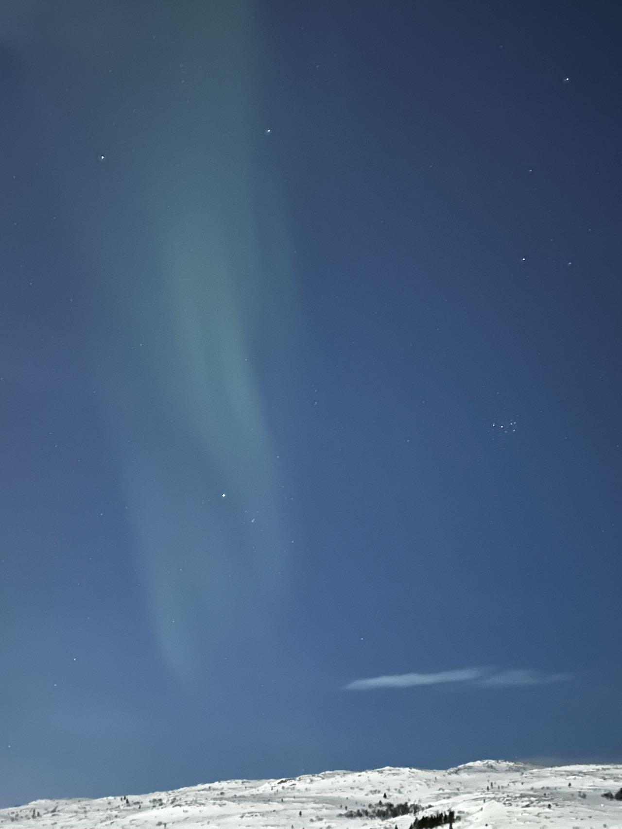 吃完帝王蟹回来,听酒店门口抽烟的大叔说晚上可能有极光,我们就晚上11点(零下17度)走到海边找极光。什么都没看到,但我们没有放弃。拿着手机相机在黑夜中探寻,居然找到了一点绿光!手疾眼快的LD赶紧拍下了这难得的极光(肉眼仿佛看到了白白的一条)。过了一会儿云聚起来了,就和极光说拜拜