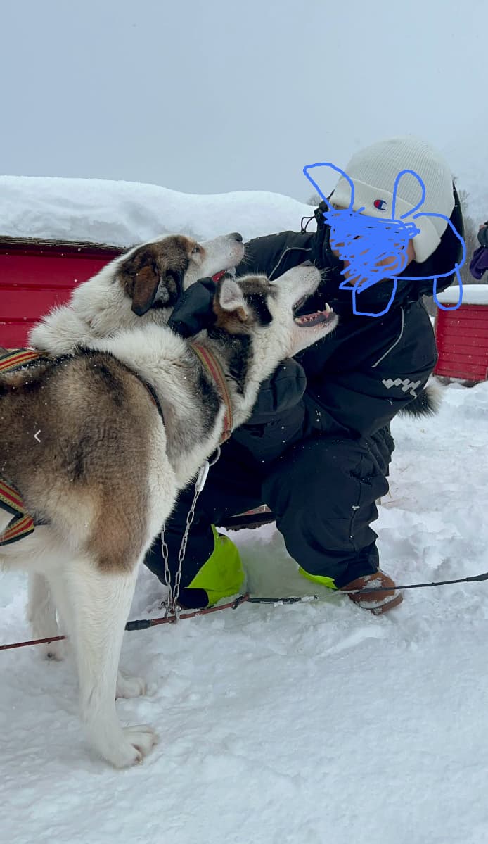 我们报的团是一个family business,他们一家人都围绕着哈士奇生活,以前还参加过狗拉雪橇的比赛。在冰天雪地的荒野里有六只可爱的狗撒欢似的带着你奔跑(然后边跑边