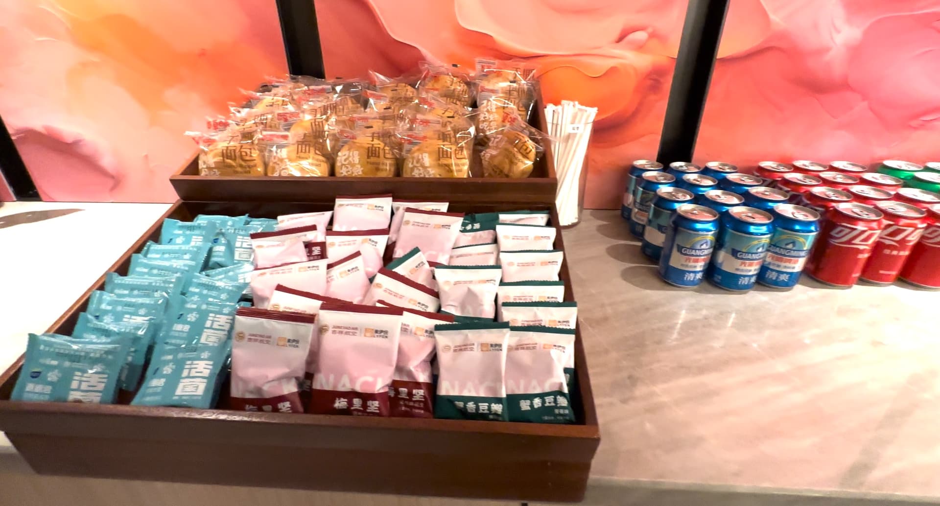 再继续往里走,居然还有一个小“房间”供应餐食,我走进去的时候,有一位休息室的工作人员在里面吃东西,见我进去了,他就马上离开了。仔细看看这里的餐食,发现有吉祥航空自己品牌的零食,在吉祥的班机上吃到过,最喜欢的是那个“梅里坚”,就是话梅味道的脆皮花生,口味很独特。