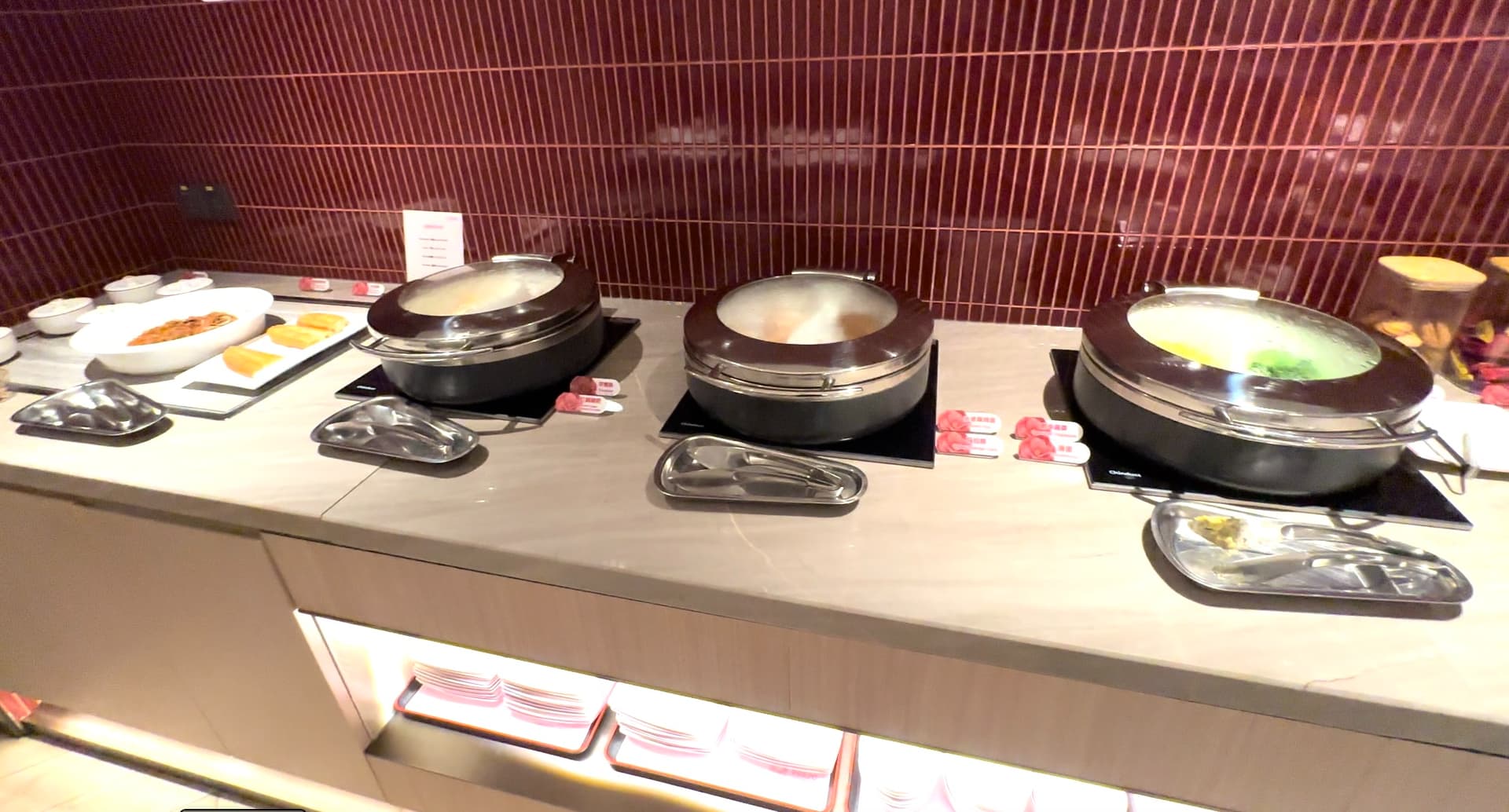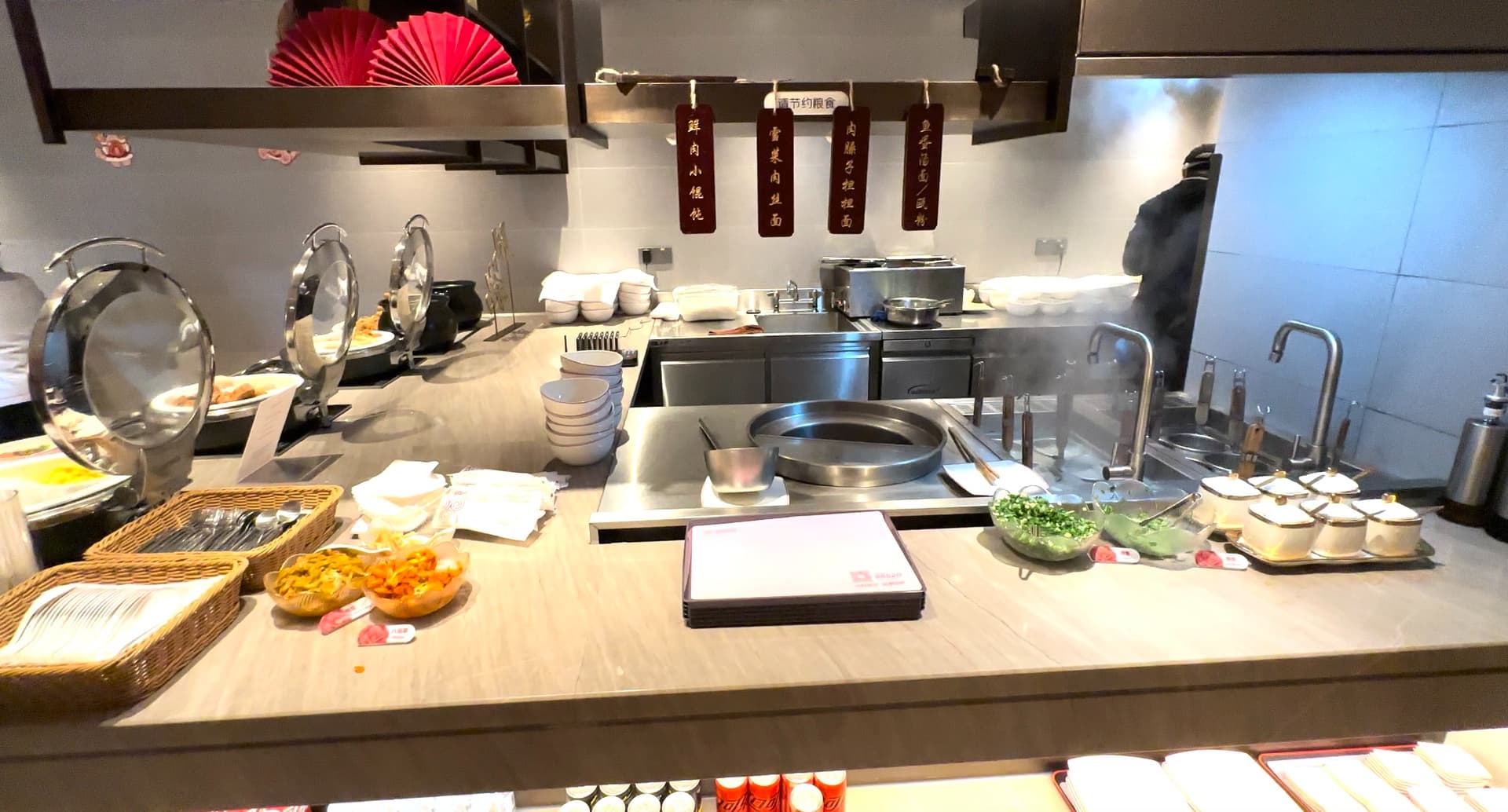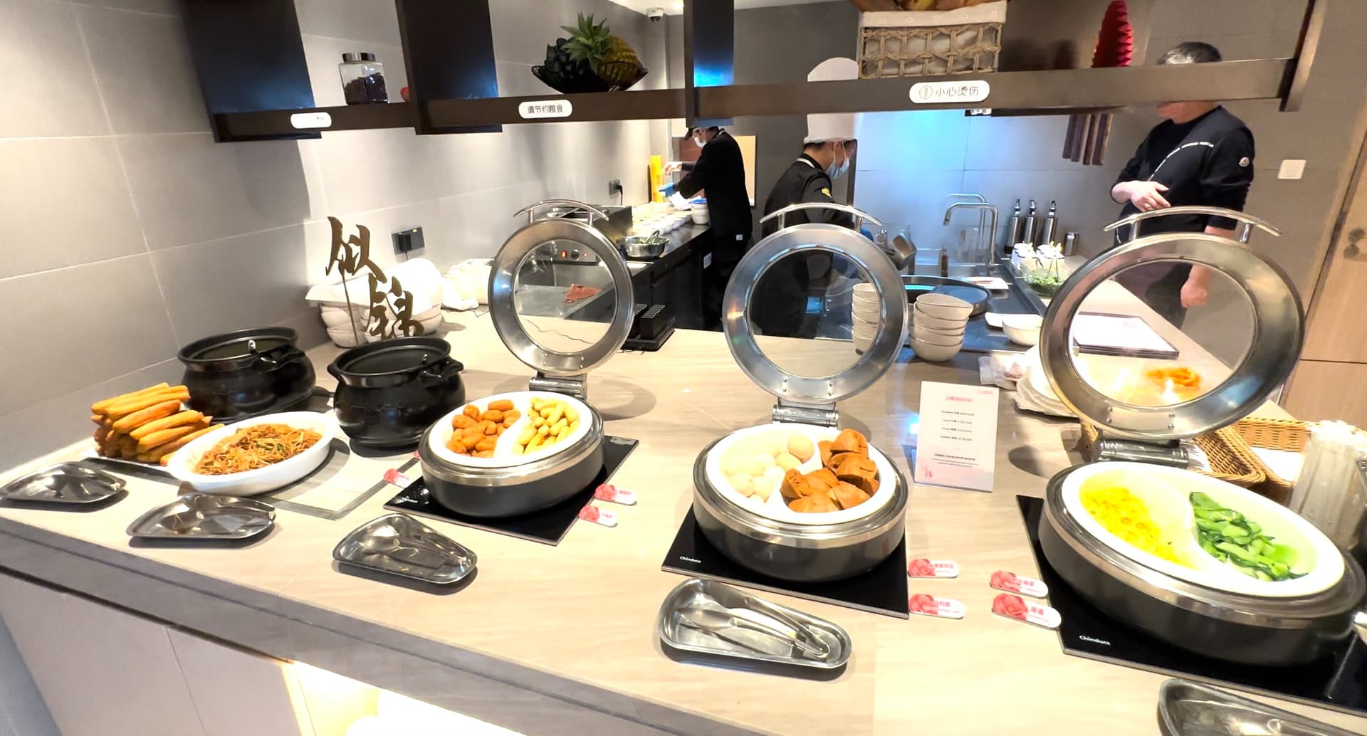 这个“房间”转过来就是餐食区,看上去也是另一个房间装修成的“厨房”,这里空间也很小,如果有十个人在里边,就会显得摩肩接踵。餐食有一个面档、自助热食,以及一些甜品水果之类的。总体看来,餐食质量不低,属于相对比较精致的。我点了一碗小馄炖,味道很不错。