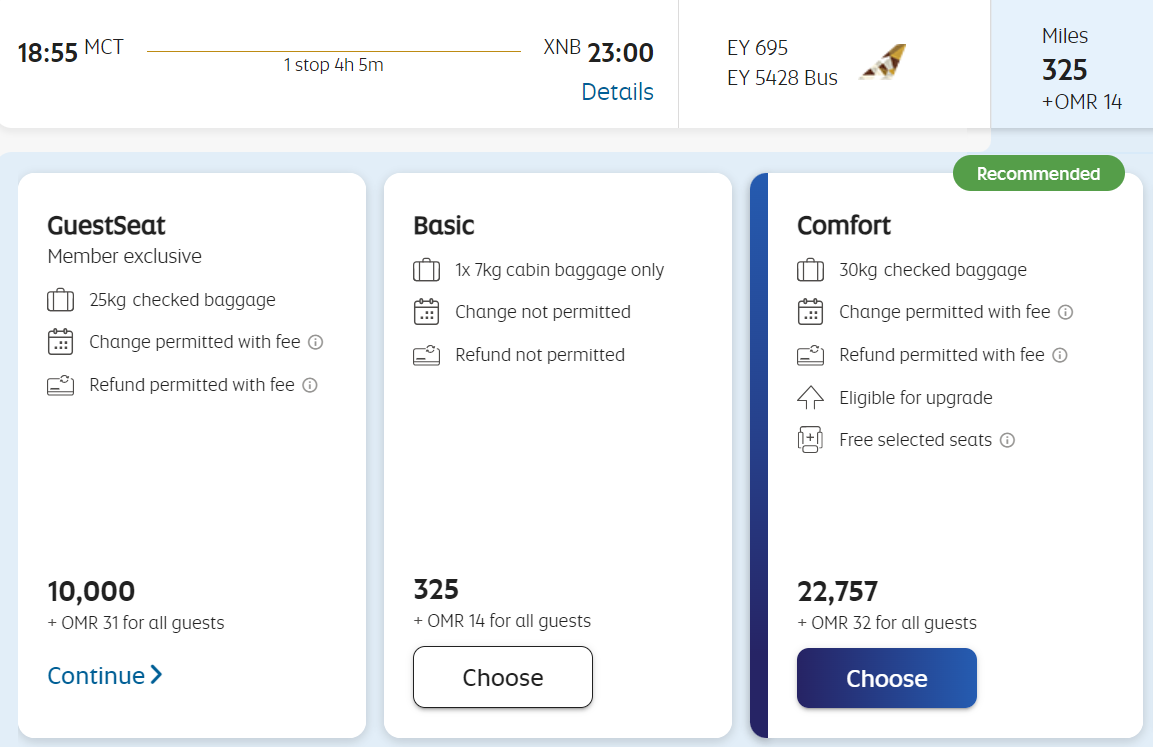 改版后,EY 自家 MCT → AUH → XNB (Etihad 免费巴士到 Dubai 市区) 一共 325 里程 + 14 OMR (对等现金票 $39, cpp = 1) 不过这个是 basic economy 不含托运行李
