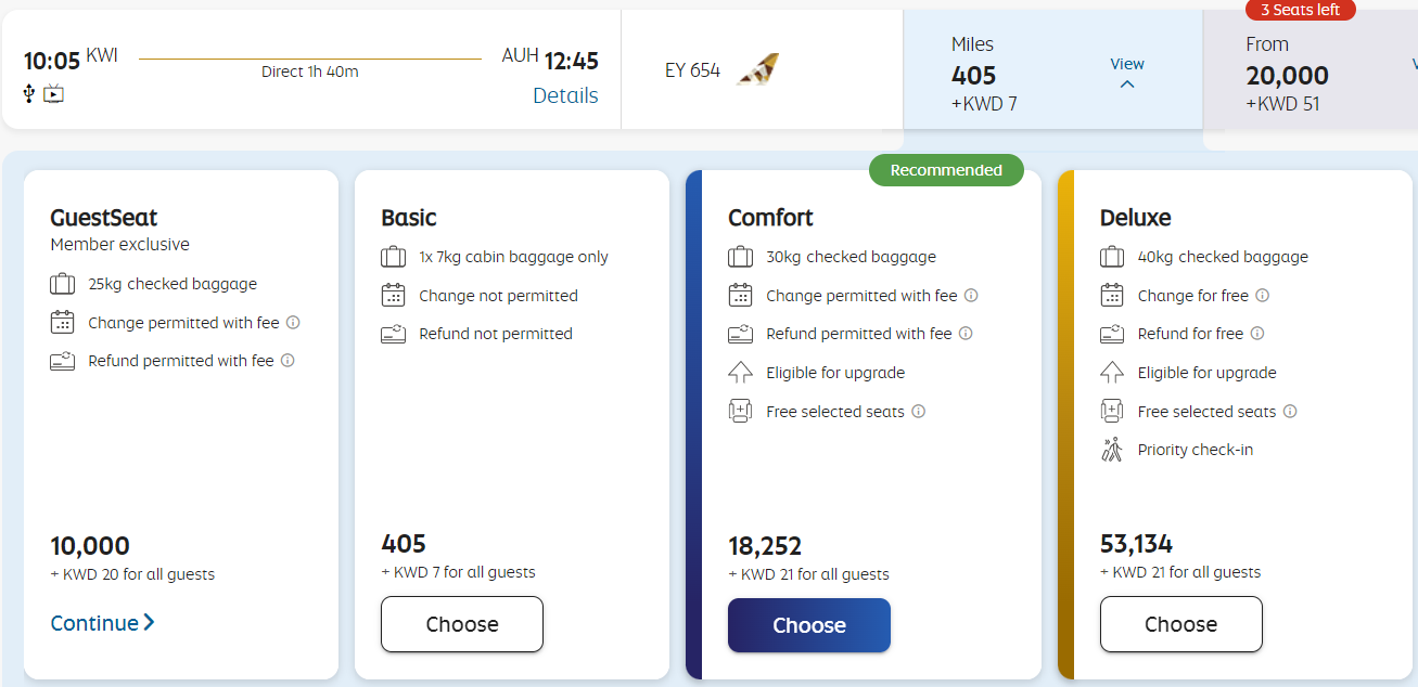 KWI → AUH 是 405 EY miles + 7 KWD ($21.8) 总税费,这个 405 不是阿联酋第纳尔,而是里程总数。当然,这个价位是所谓的 basic economy,不包托运行李。但是即便如此,我还是第一次见航空公司这样卖票的,几乎等于送票。这个 7 KWD ($21.8) 跟我在法航查到的 EY 同航线总税费差不多。