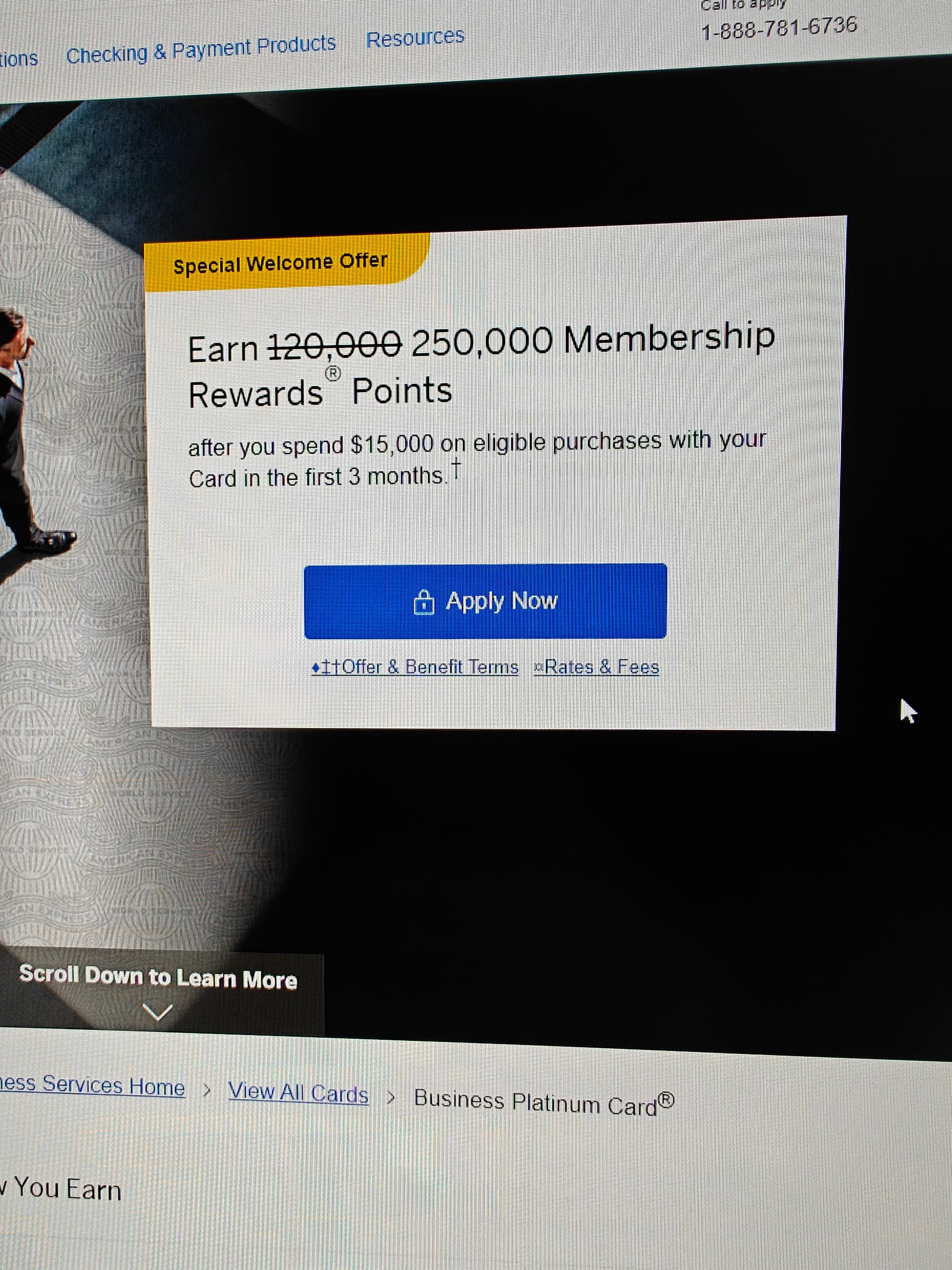 last night I open windows edge incognito browser and search AmEx business card and I got both AmEx plat business 250k after 15k spend and AmEx gold business 150k after 10k spend offers; took 3 attempts but it does appear. (might of also got extremely lucky)