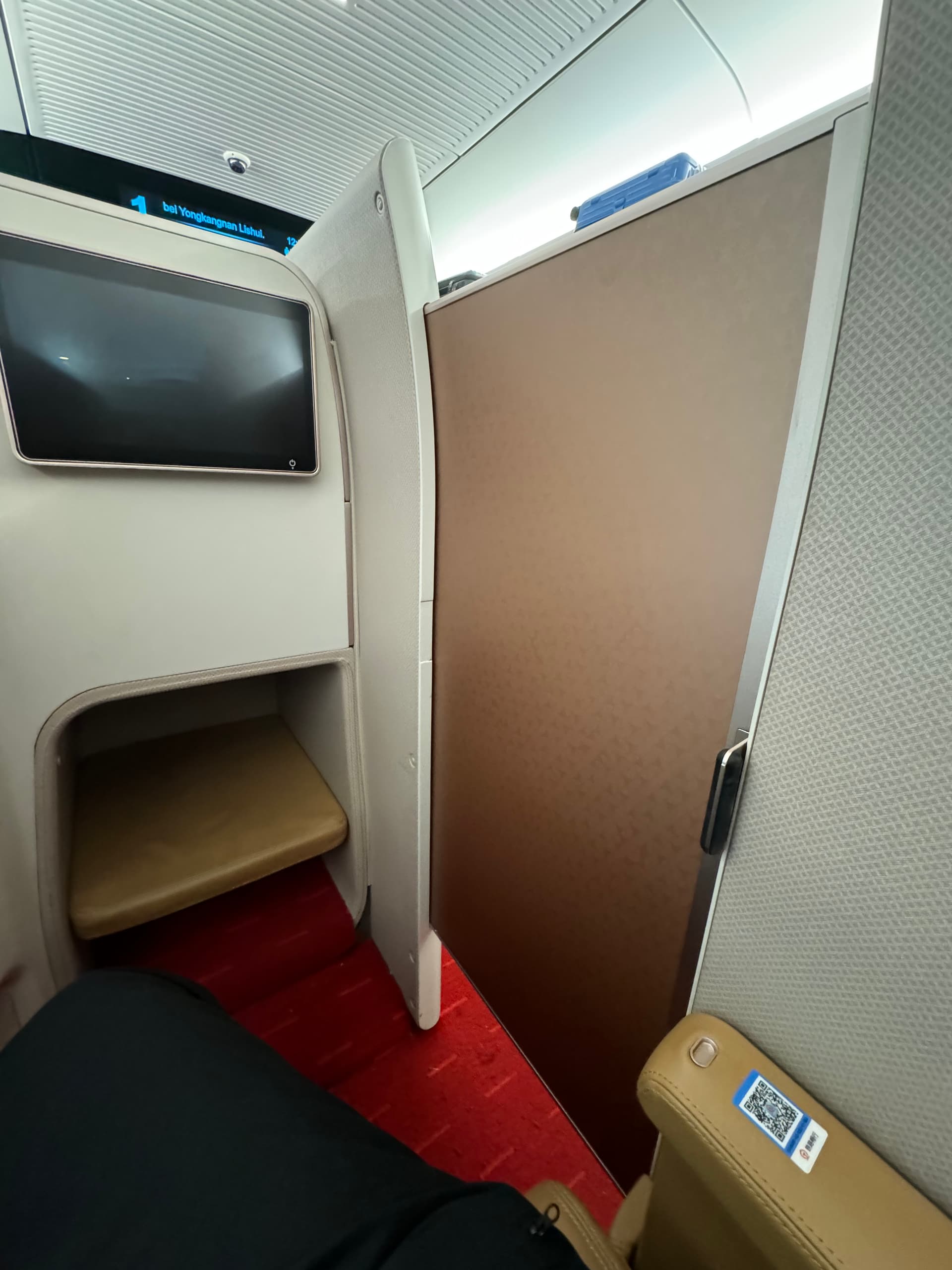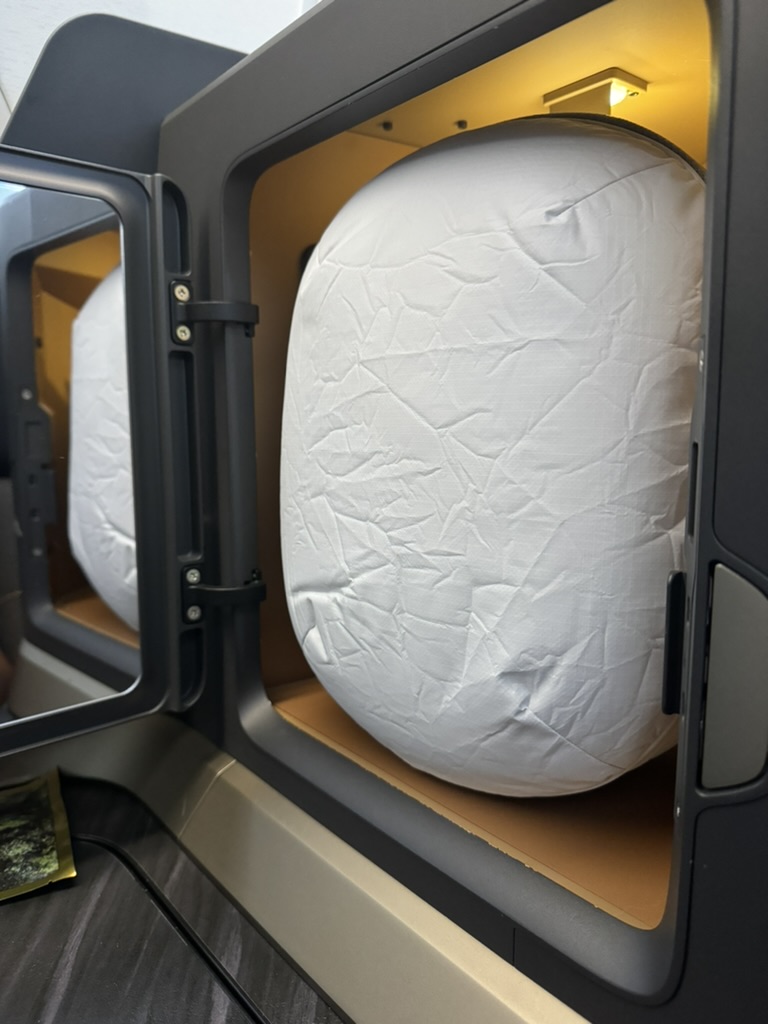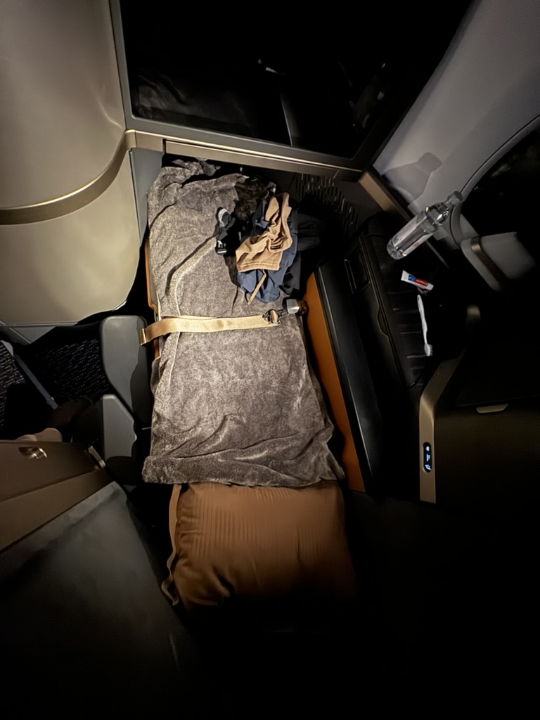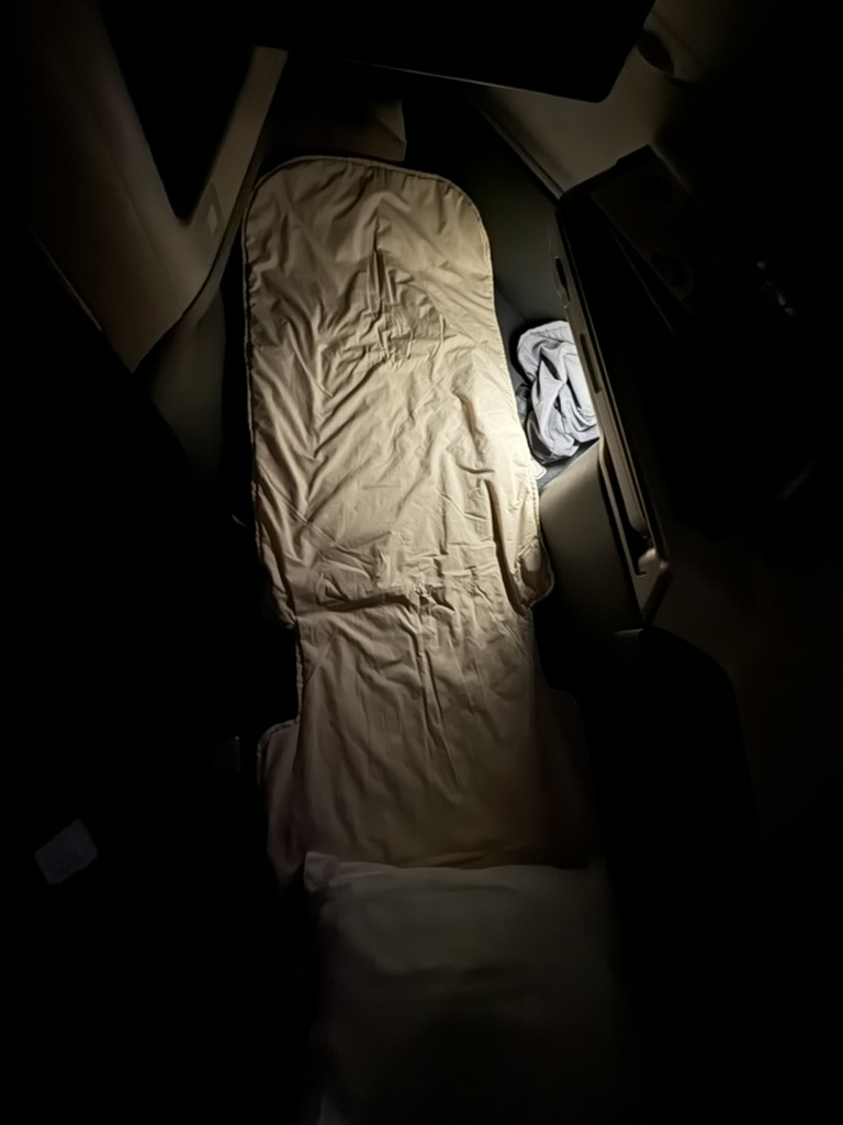 睡觉的时候放脚的地方是我飞的这么多商务里最小的了。非常窒息,脚完全动不了。