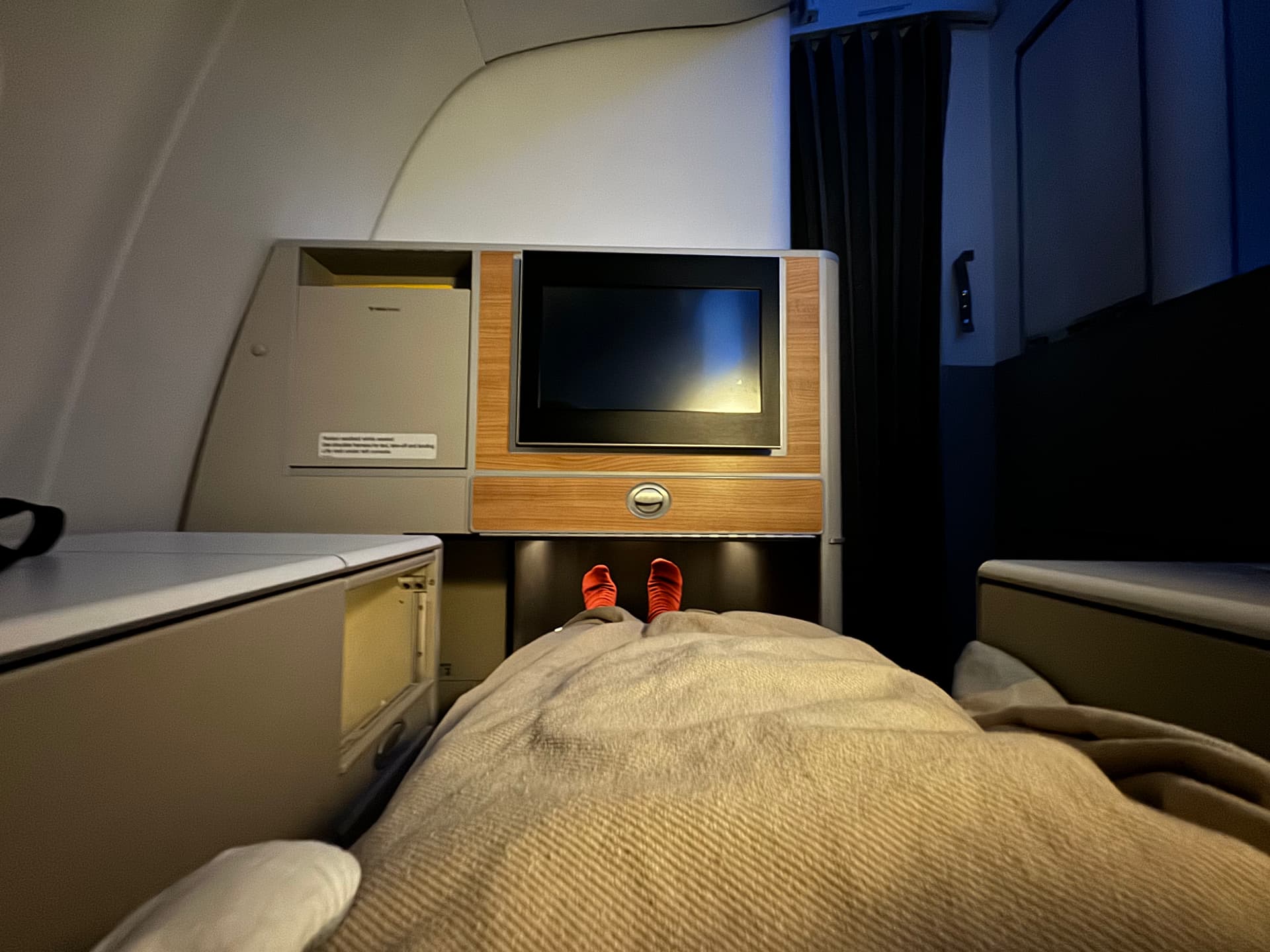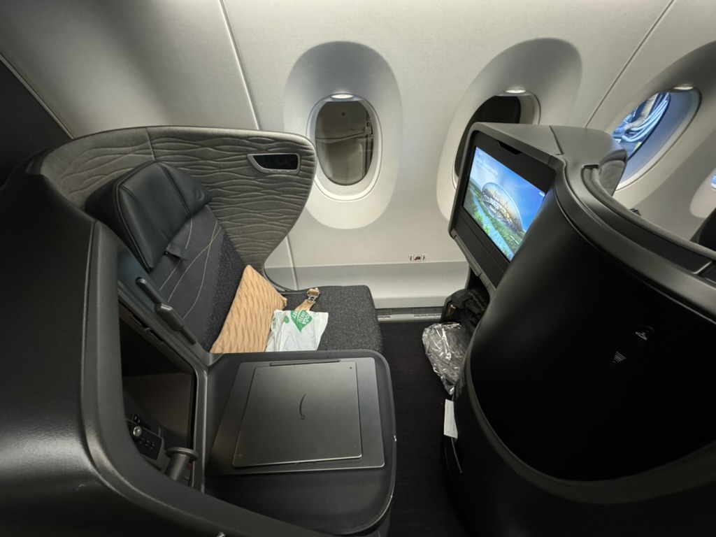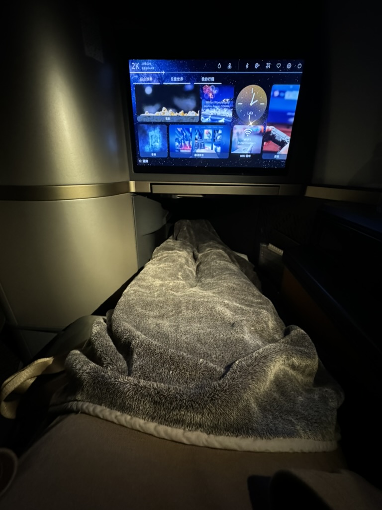 但是,身体上空间却不是很足。throne seat两边完全控制了中间的seat的大小。坐着的时候不觉得小因为真的不小,但是躺下来的时候,就会增加两个臂膀的宽度,就会觉得自己被夹得紧紧的。为什么其他商务舱没有这种感觉呢?我觉得有两个原因:1. 其他商务舱脚部空间太小让人忘了上身也不舒服, 2. 很多商务舱座位之外还是有一些横着的空间,可以让自己的肉探出,从而不会觉得很紧。