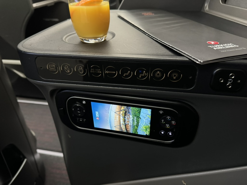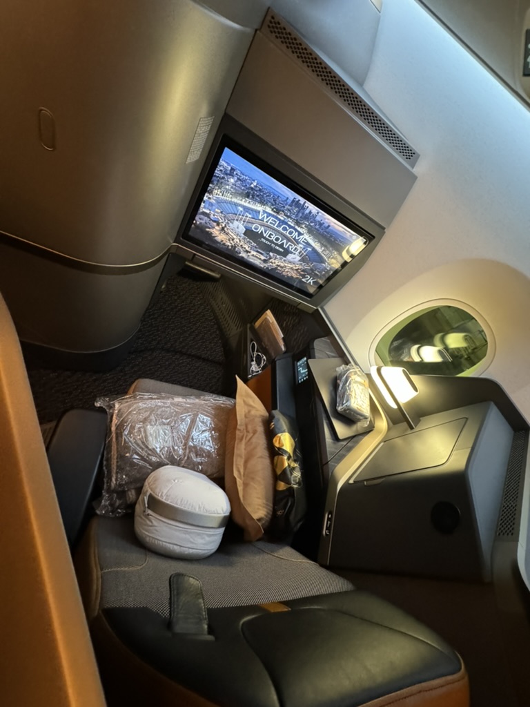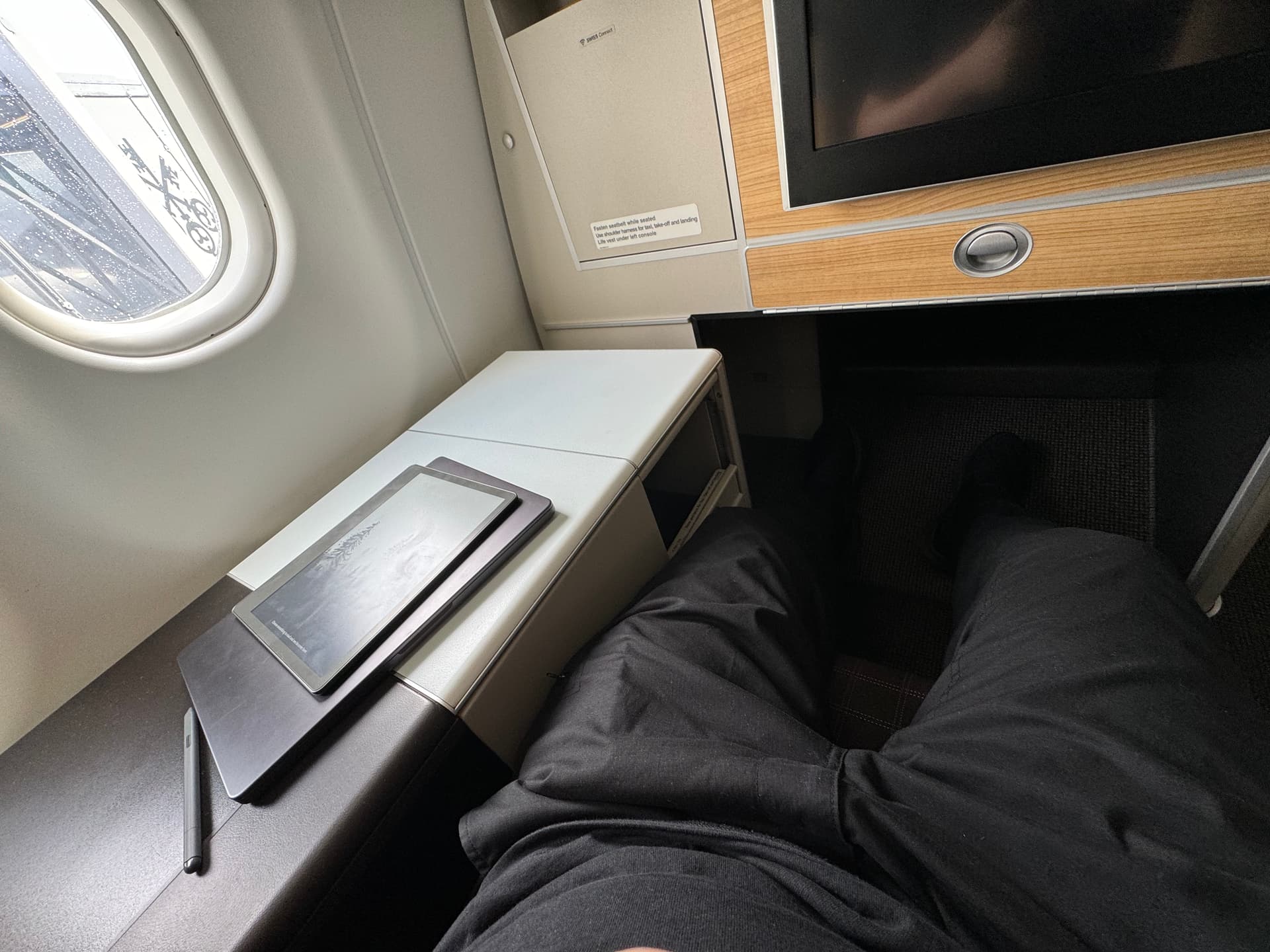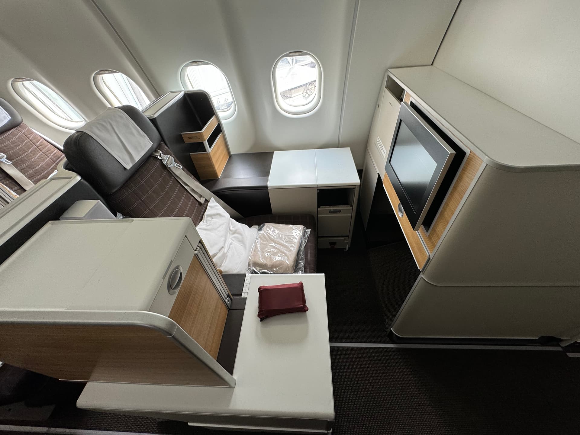 但是,身体上空间却不是很足。throne seat两边完全控制了中间的seat的大小。坐着的时候不觉得小因为真的不小,但是躺下来的时候,就会增加两个臂膀的宽度,就会觉得自己被夹得紧紧的。为什么其他商务舱没有这种感觉呢?我觉得有两个原因:1. 其他商务舱脚部空间太小让人忘了上身也不舒服, 2. 很多商务舱座位之外还是有一些横着的空间,可以让自己的肉探出,从而不会觉得很紧。
