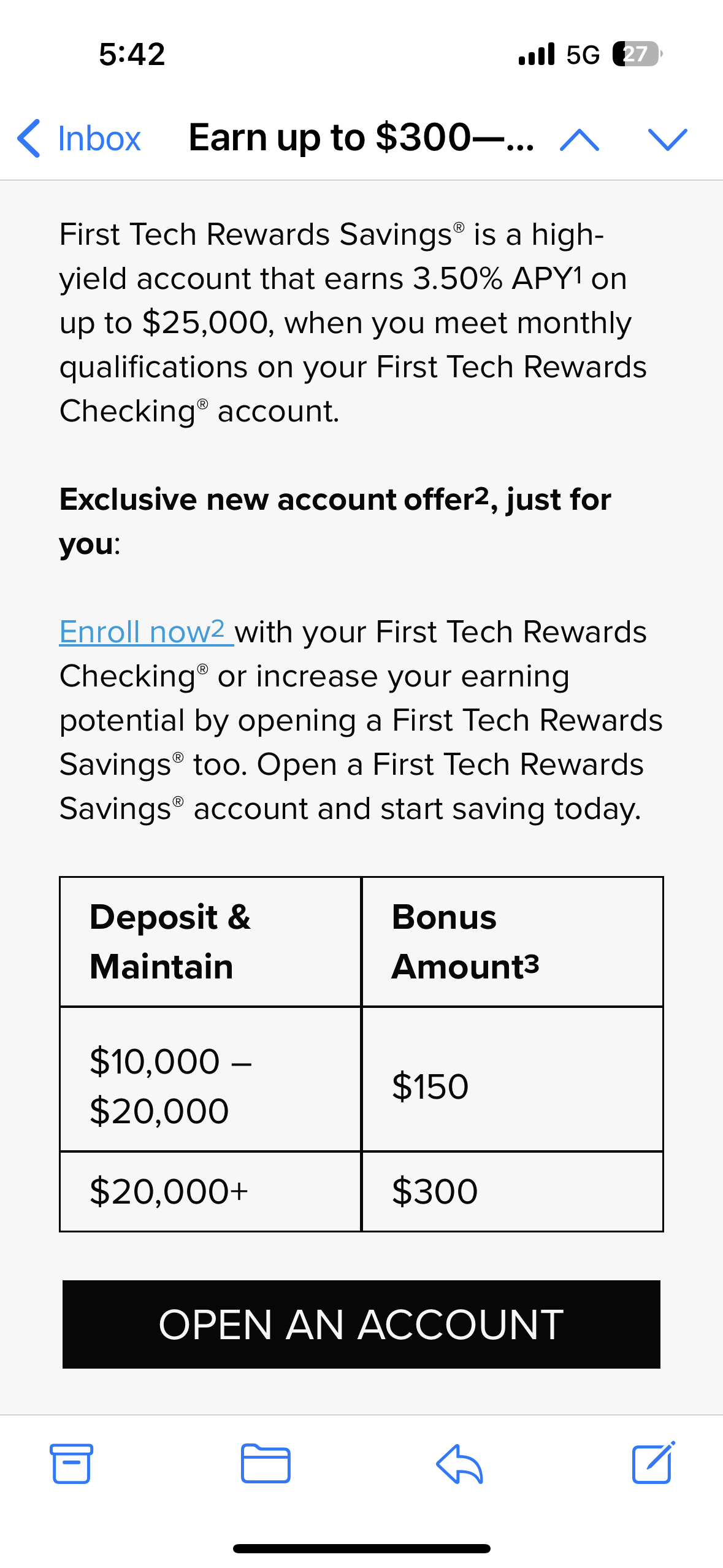 7/2收到邮件Congratulations, you’ve earned a $300 bonus from First Tech!