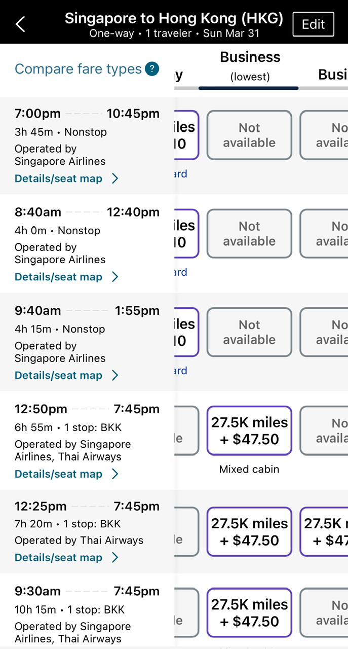 intra Asia 美联航里程很实用。开个香港-曼谷-新加坡 商务全程 不到30K