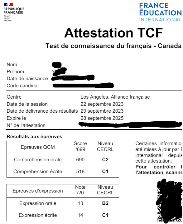 23/09/29: TCF (CLB 10-8-9-8), LA法盟, 再办预体检 +工作证明 (雇主信+工资流水)+翻译+学位认证