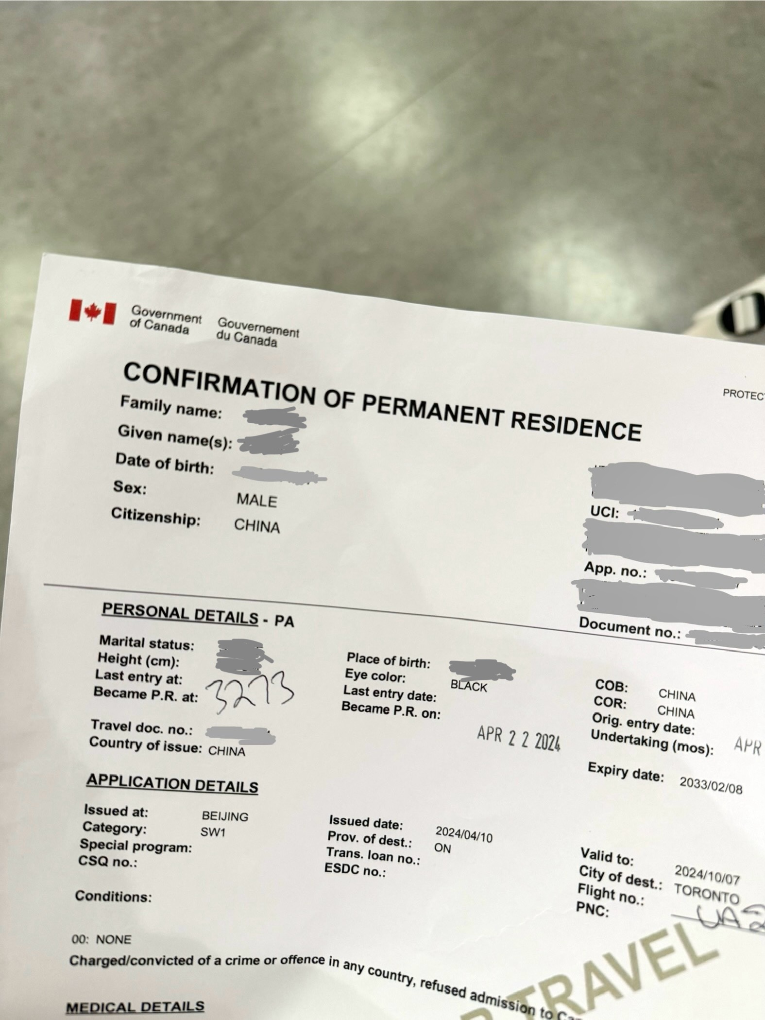 2024/04/16: 收到护照+immigration visa (单次有效) + Confirmation of PR.
