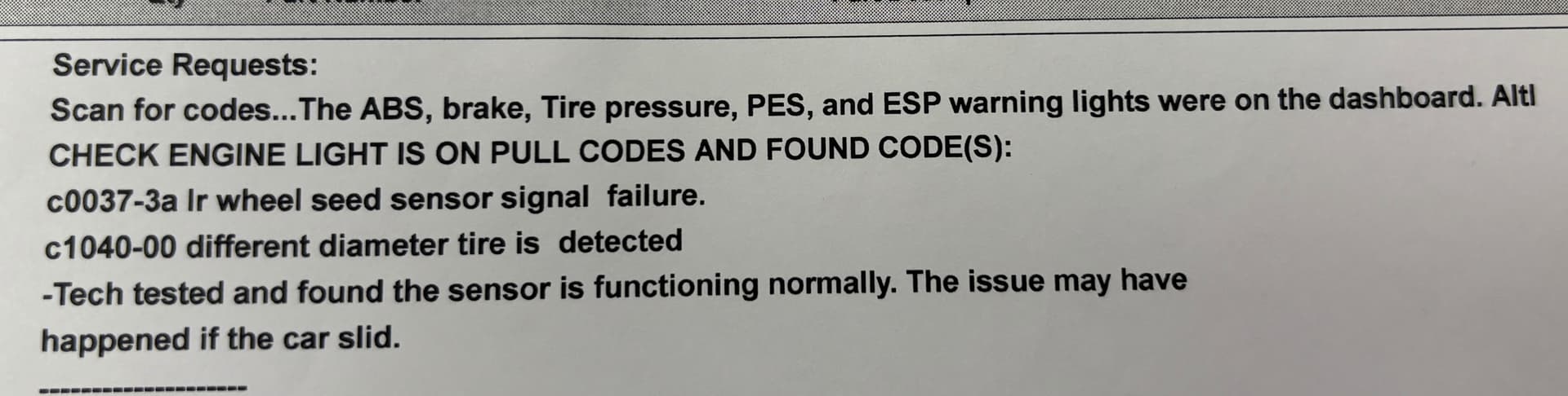 第二天早上通勤时发现车的仪表盘有好几个灯亮 - ABS,EPS, AWD,胎压灯,Traction control system,brake system。重启多次后依旧亮,松油门后的阻力依旧存在。去了街边的auto repair店检测了半天说找不出问题,建议我去4s店。