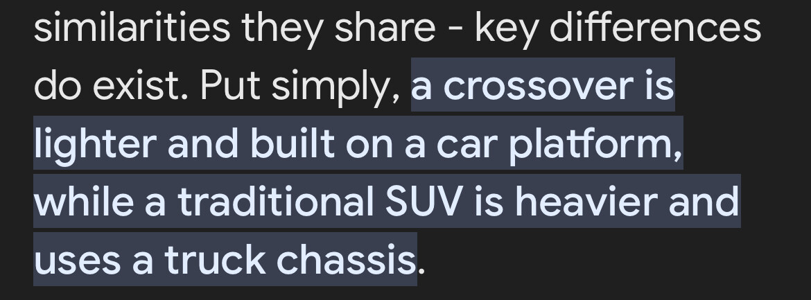 Body-on-frame SUV 才是 (imo) 真SUV, 也是很多地方为什么 SUV (incl. unibody) 的后挡和后排可以 tint, 而轿车不行的原因。