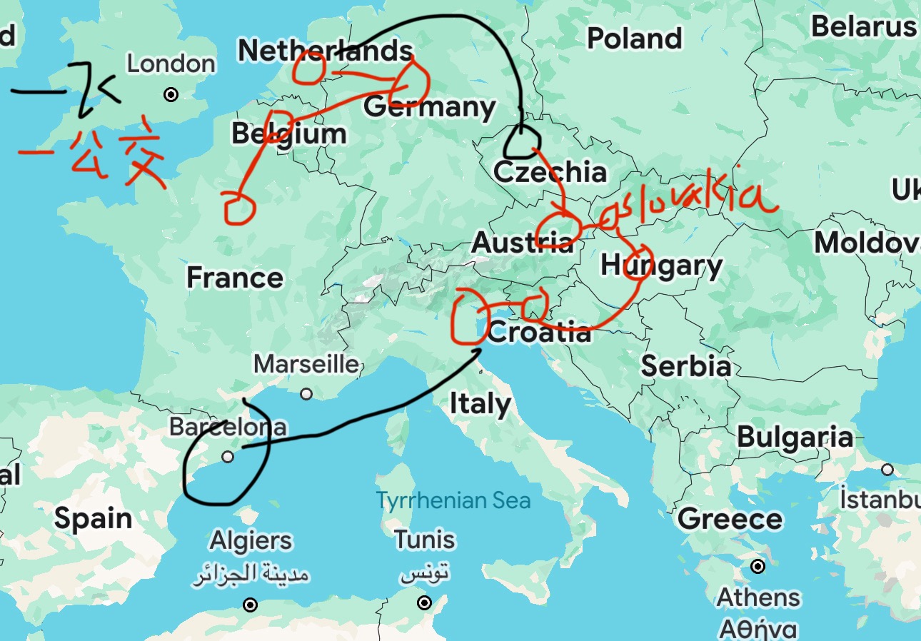 法国巴黎两天-FlixBus->比利时布鲁塞尔- FlixBus->科隆-flixbus>捷克布拉格- FlixBus>奥地利维也纳- FlixBus>匈牙利布达佩斯-一个半小时飞机>意大利威尼斯-俩小时飞机>西班牙巴塞罗然后回芝加哥