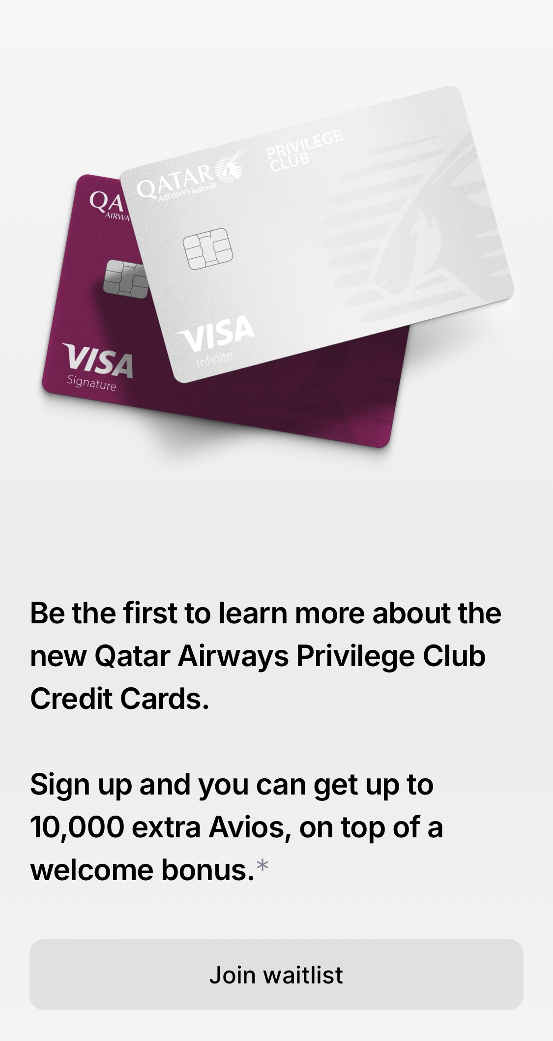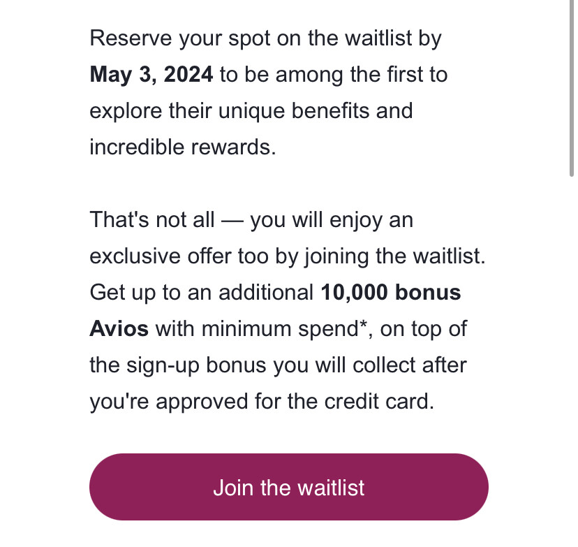 今天收到一封卡塔尔航空发来的邮件,宣布即将与Cardless合作在美国发行一张联名信用卡。比较特别的promotion是如果在5月3日之前Join the Wait List ,到时候卡发行的申请成功的话,除了一般开卡奖励外会有额外10k avios 开卡奖励。