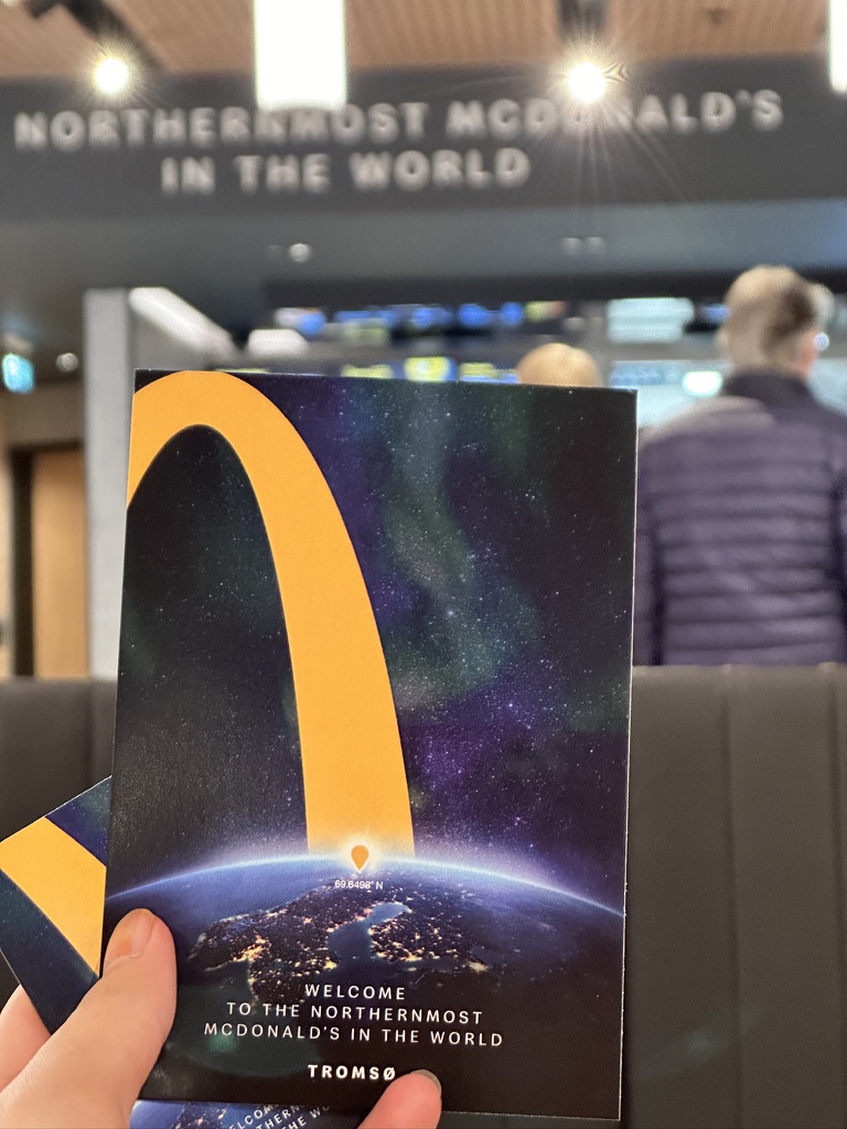 特罗姆瑟市内有刚开业“世界最北”麦当劳,里面可以拿纪念明信片。挪威麦当劳相比美国,多了一个名叫hot wings的单品,味道不错。