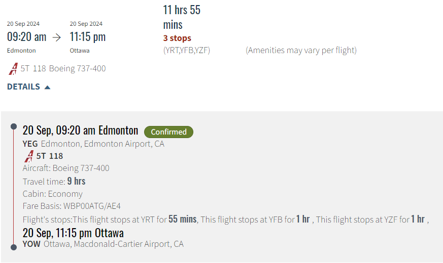 虽然显示Direct实际上是YEG-YZF-YRT-YFB-YOW,同一架飞机飞4个segment,应该不存在赶不上(毕竟就是同一班机)的问题?