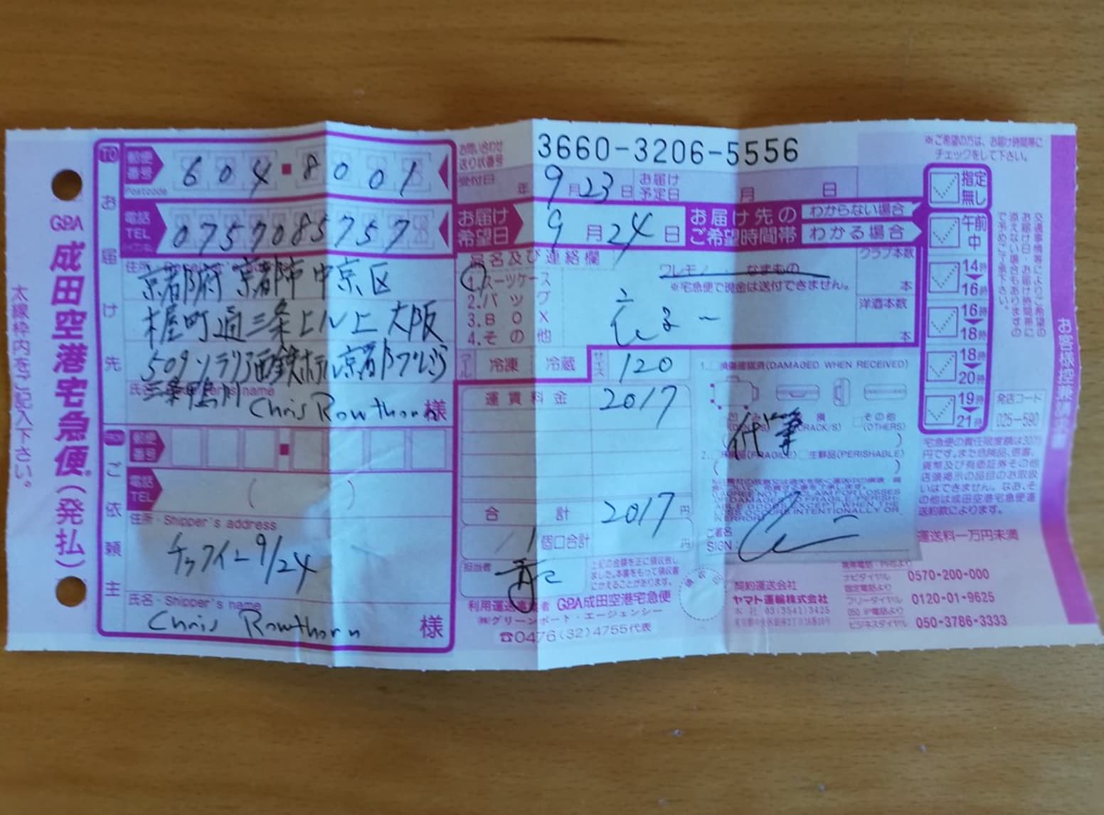这个邮寄服务(宅急便, Takkyubin) 应该是日本各城市大酒店之间, 机场和酒店之间, 便利店和酒店之间都可寄. 以下附上我在别的网站上搜到的快递单样本以供参考~