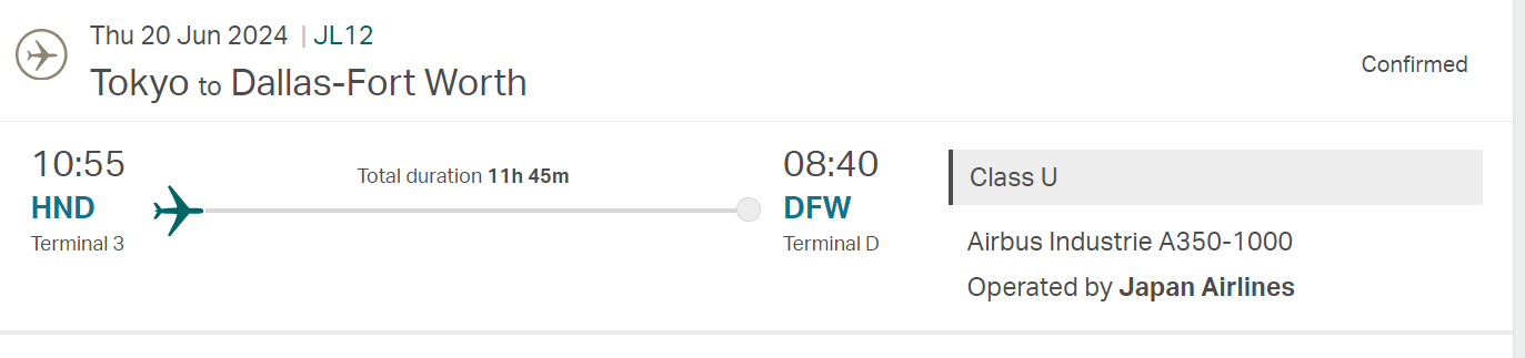 LD的票就用了 美卡 BOA Alaska miles 80k + $46 换了一张 HND → DFW JAL 商务