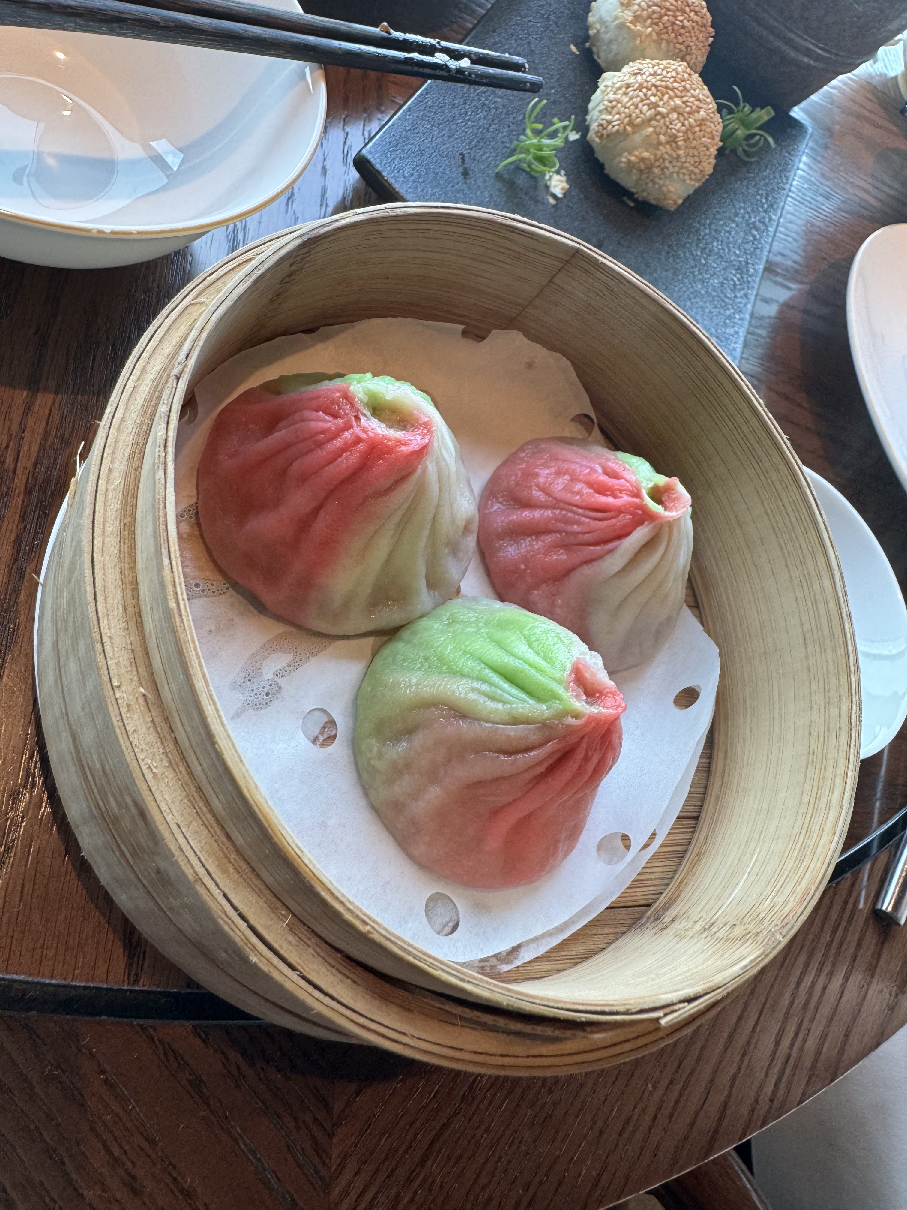 应该就是面粉里放了不同素菜的汁液导致的。和普通小笼包没有任何区别。