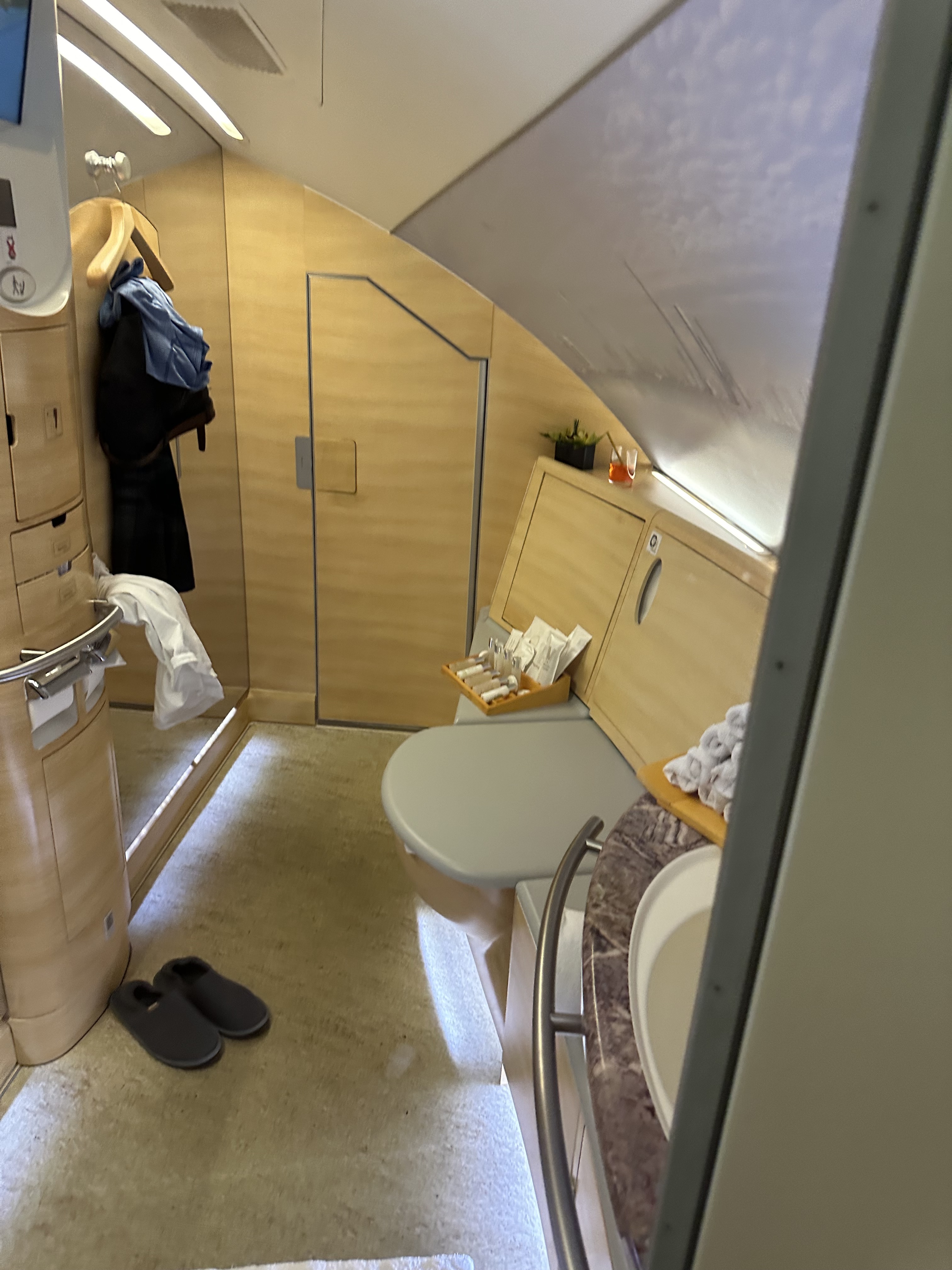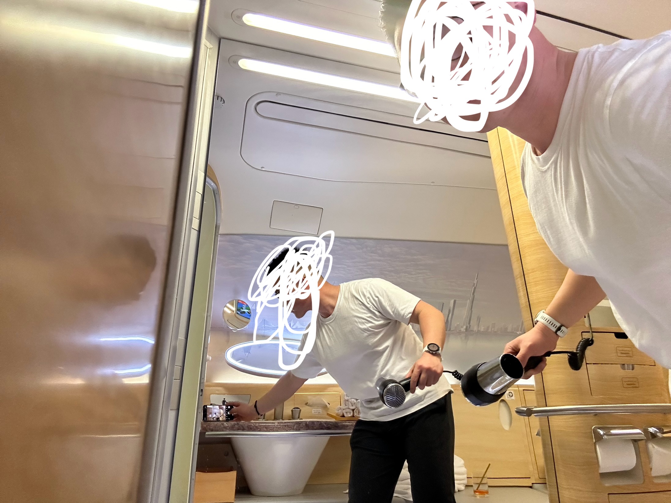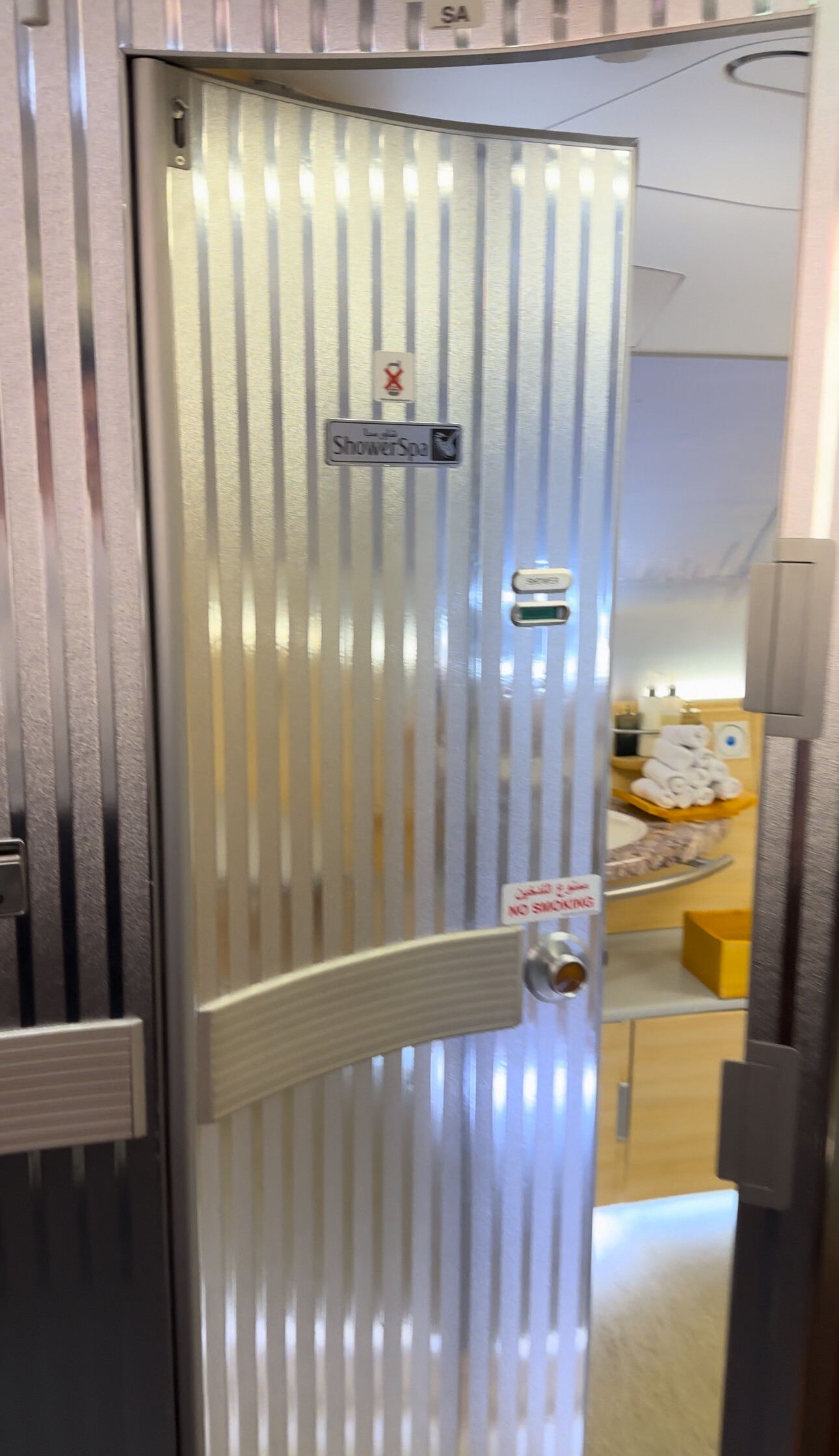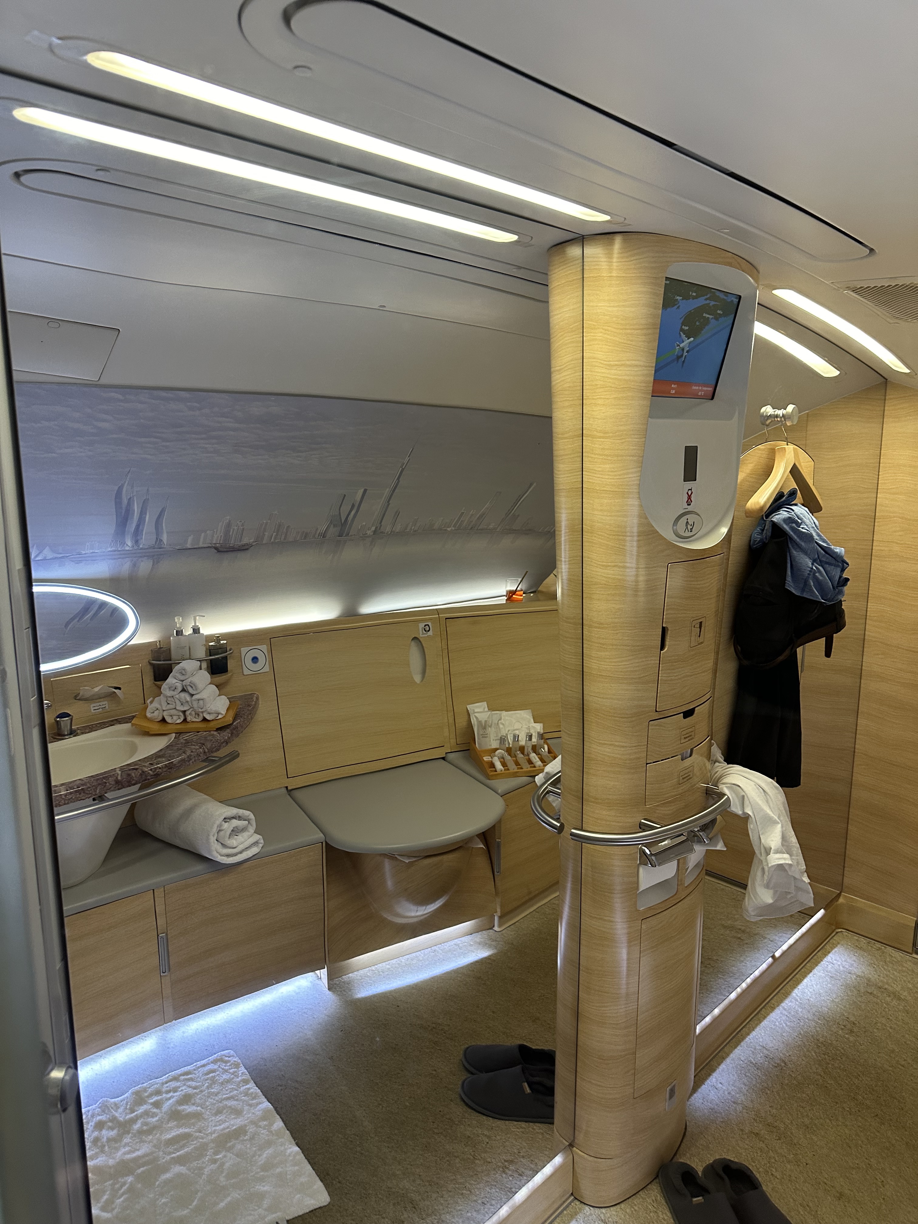 这380上一共有俩澡堂子位于第二层的客舱前部,然后有专门的人员负责清洁,大概在飞机飞平之后空乘会过来问你需要什么时候洗澡,然后会提前告知我,我只能使用那个空间半小时,然后有五分钟的热水。