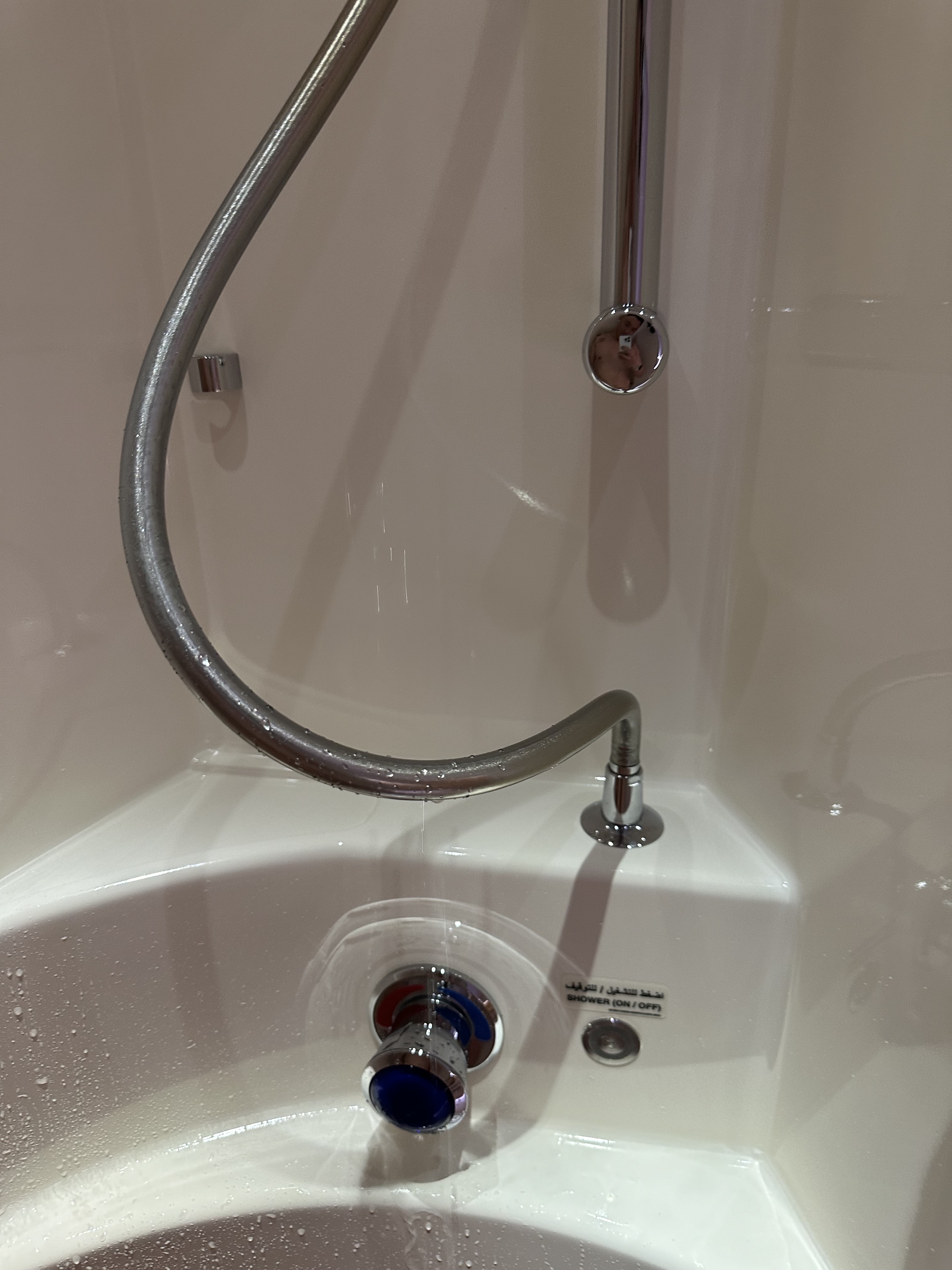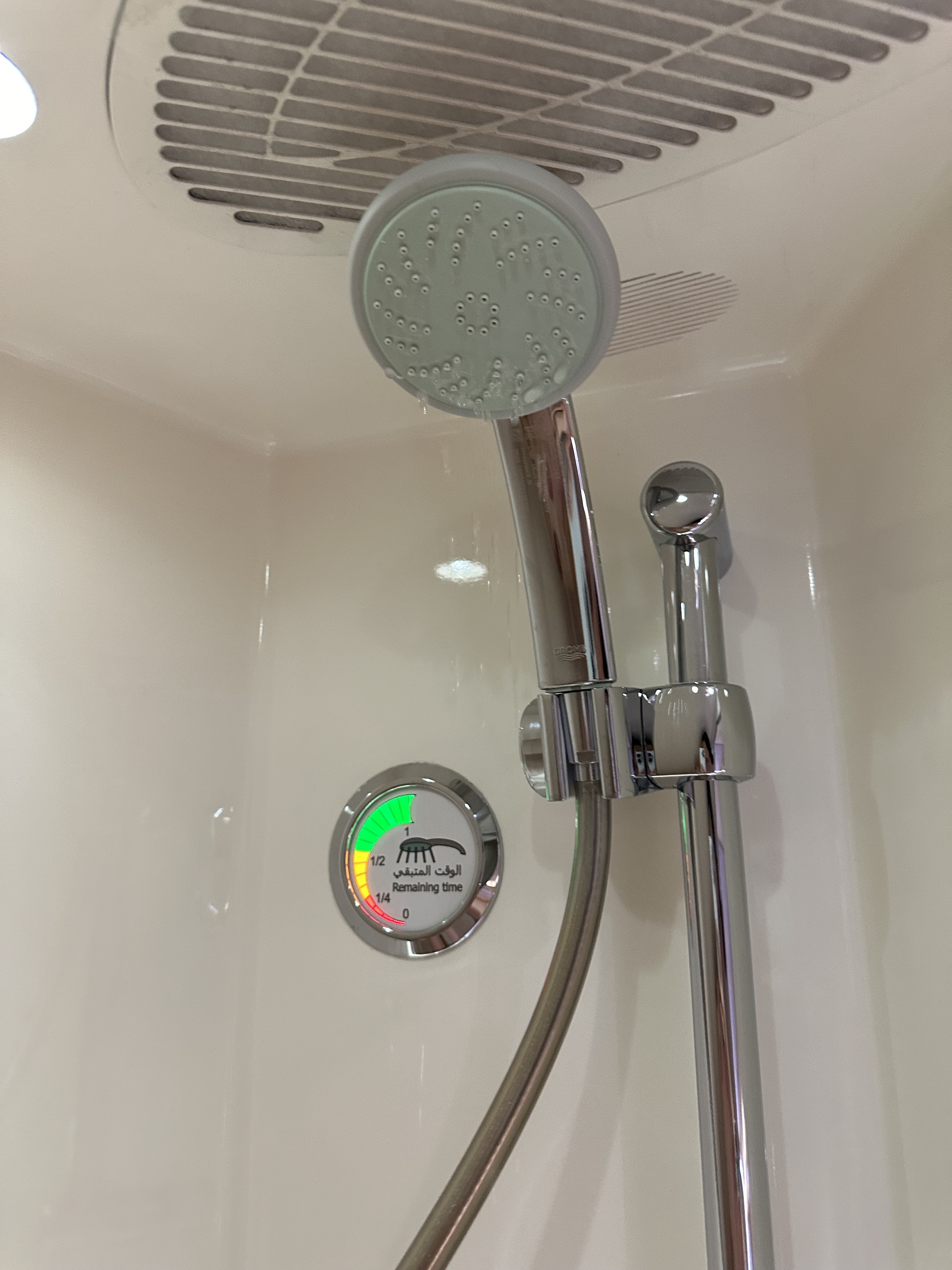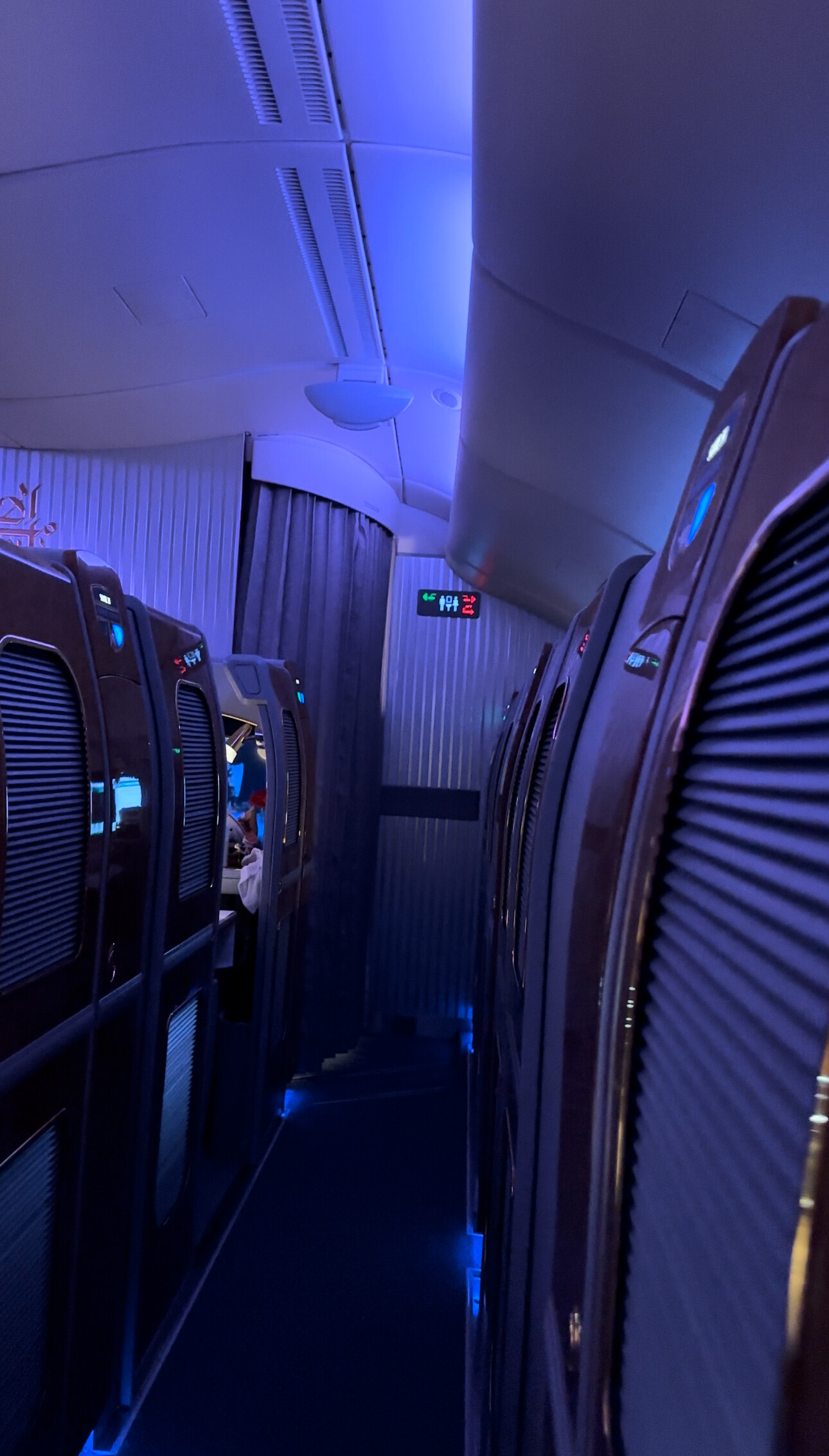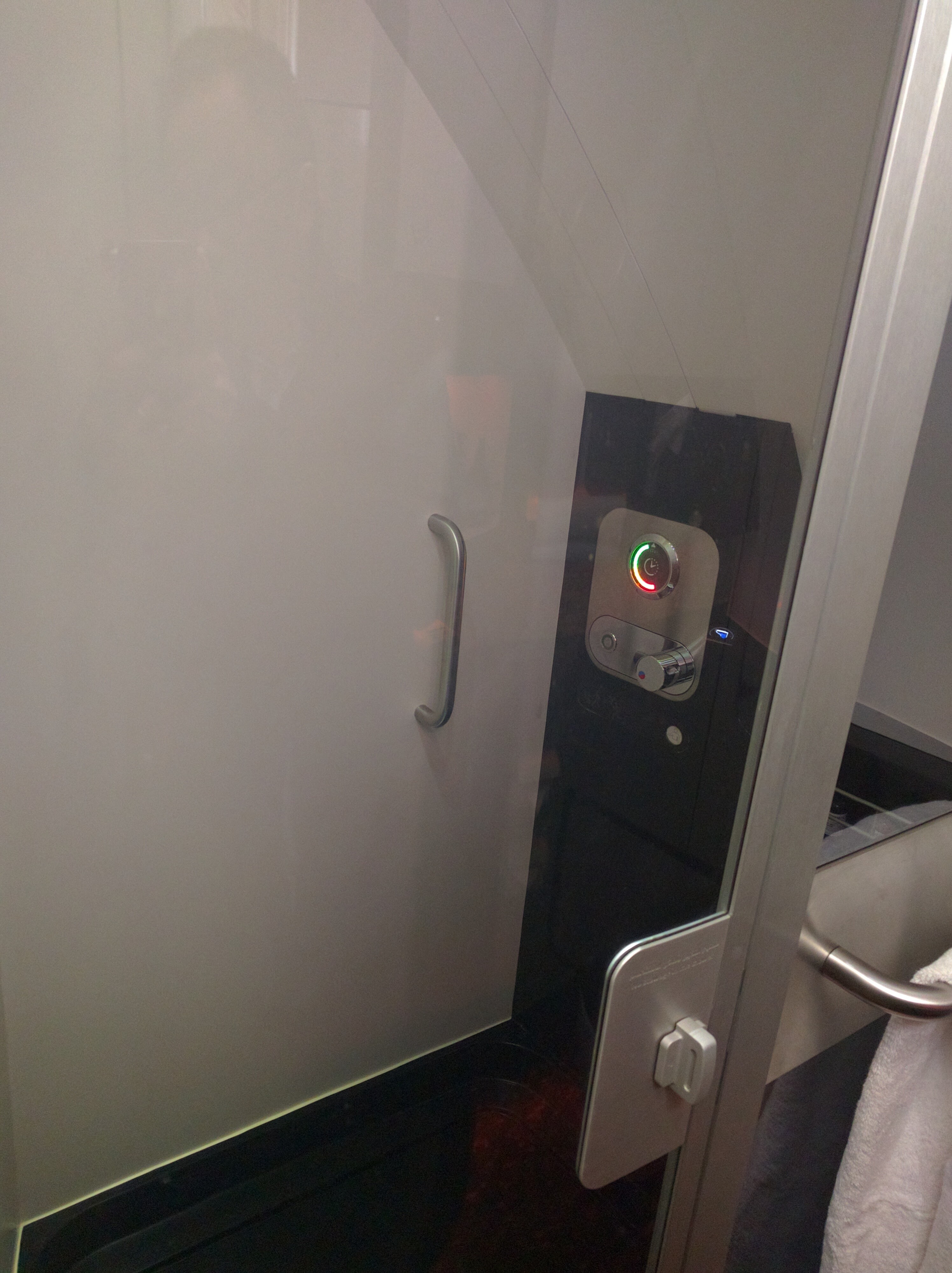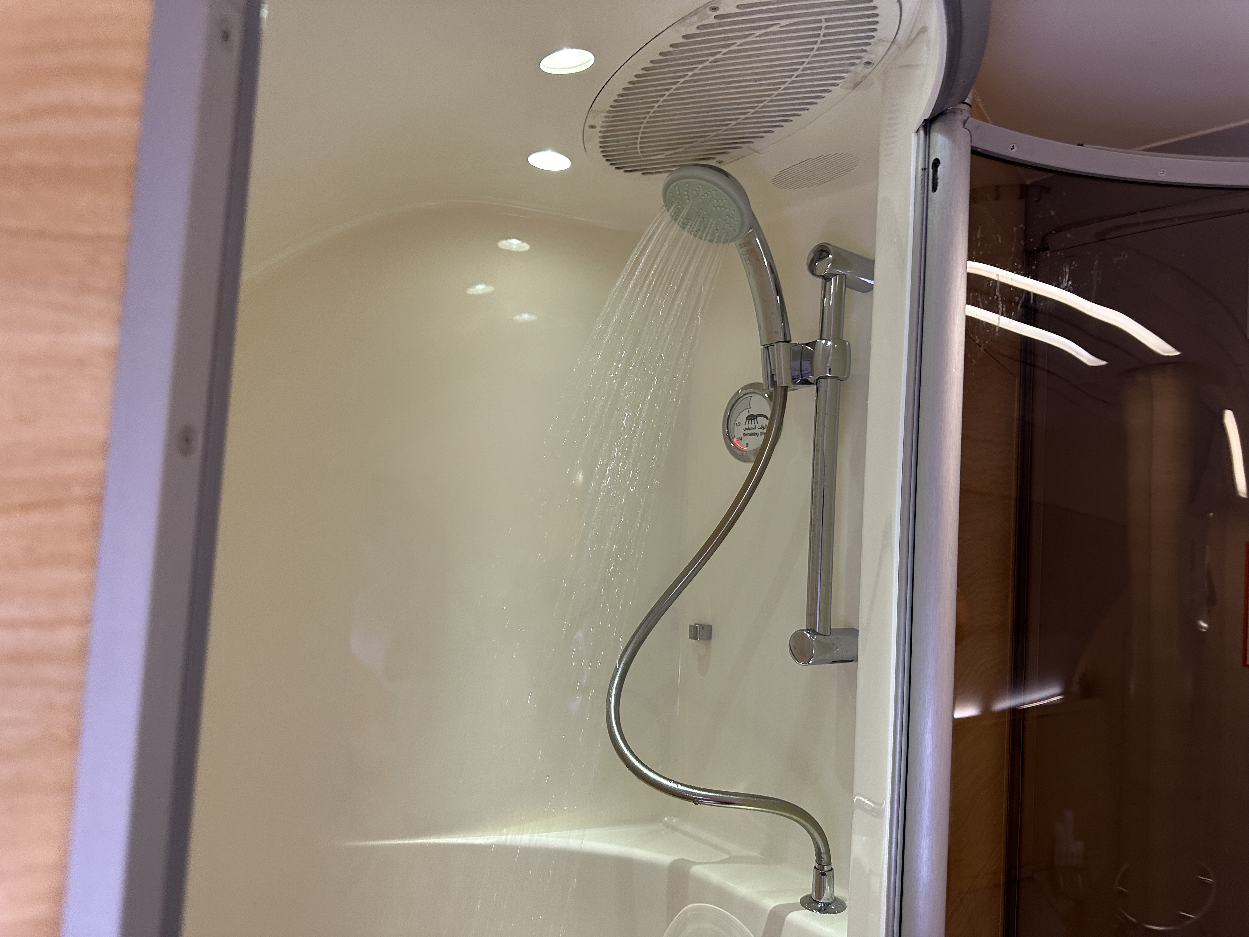 这380上一共有俩澡堂子位于第二层的客舱前部,然后有专门的人员负责清洁,大概在飞机飞平之后空乘会过来问你需要什么时候洗澡,然后会提前告知我,我只能使用那个空间半小时,然后有五分钟的热水。