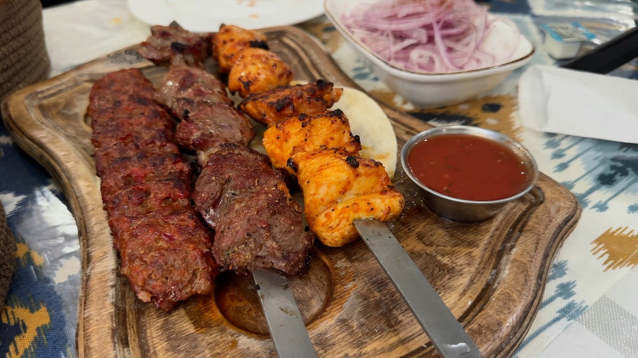 烤肉12一串不送sides,主食也都20+不送sides,两人分一个appetizer salad,加两个entree两个串,再加两杯饮料,连着小费至少120+。