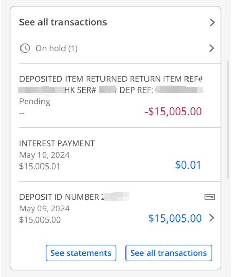 但是今天,突然发现我的boa账户15005刀退回来了,交易明细为returned,同时chase的saving账户可用变成-15005,之前的存支票依然为on hold 状态。
