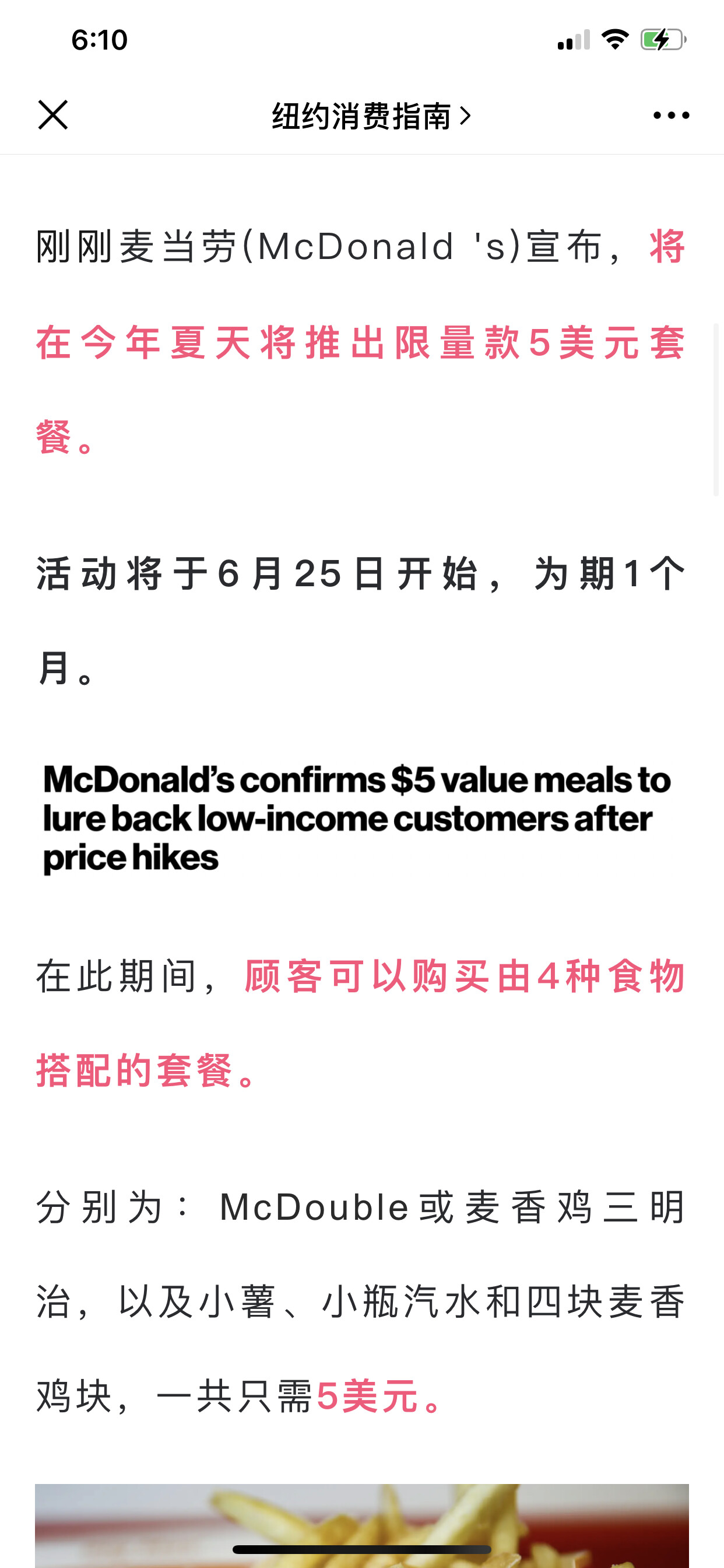 麦当劳公司表示,此套餐是为受到通货膨胀影响的低收入人群所设。