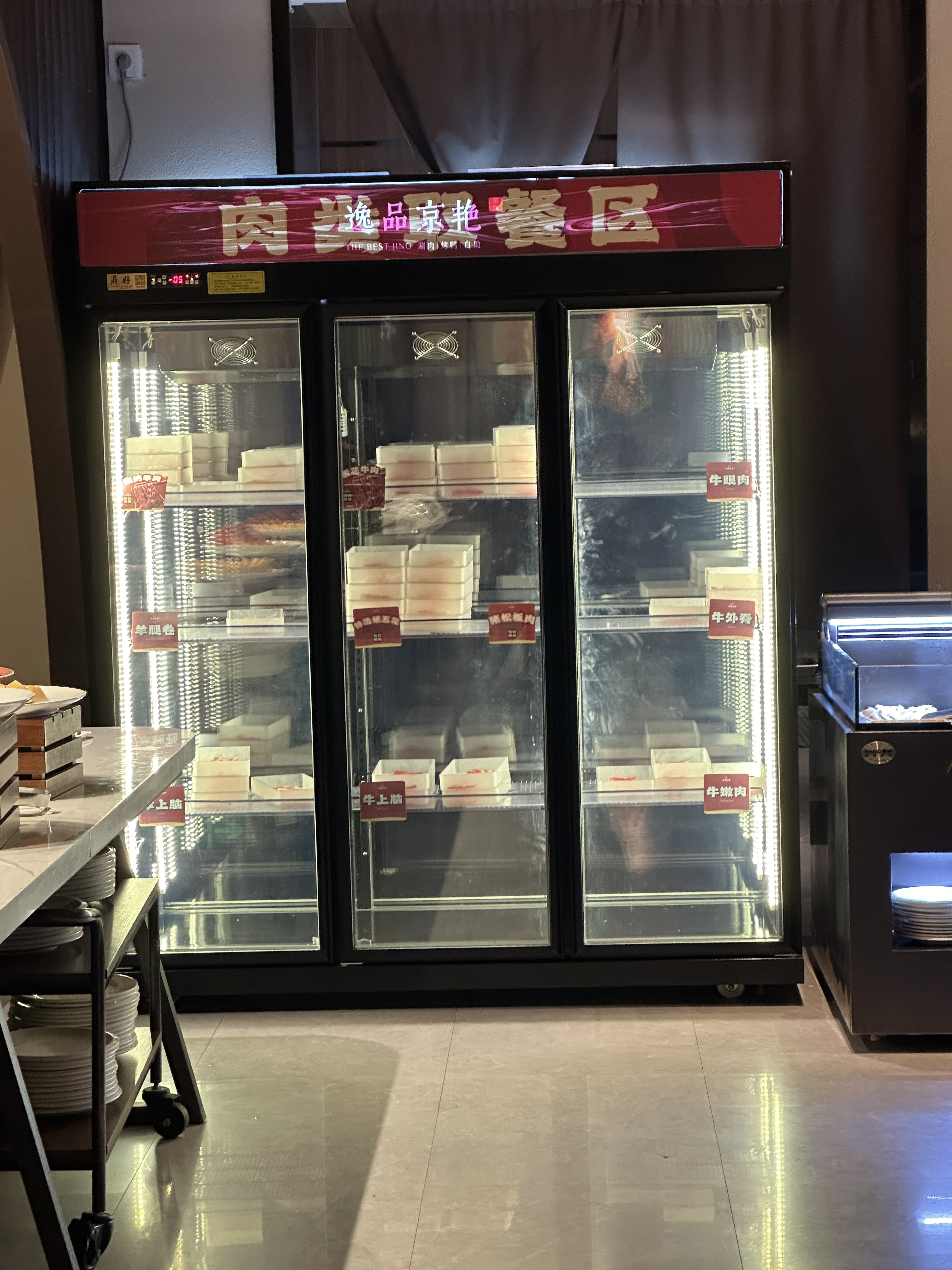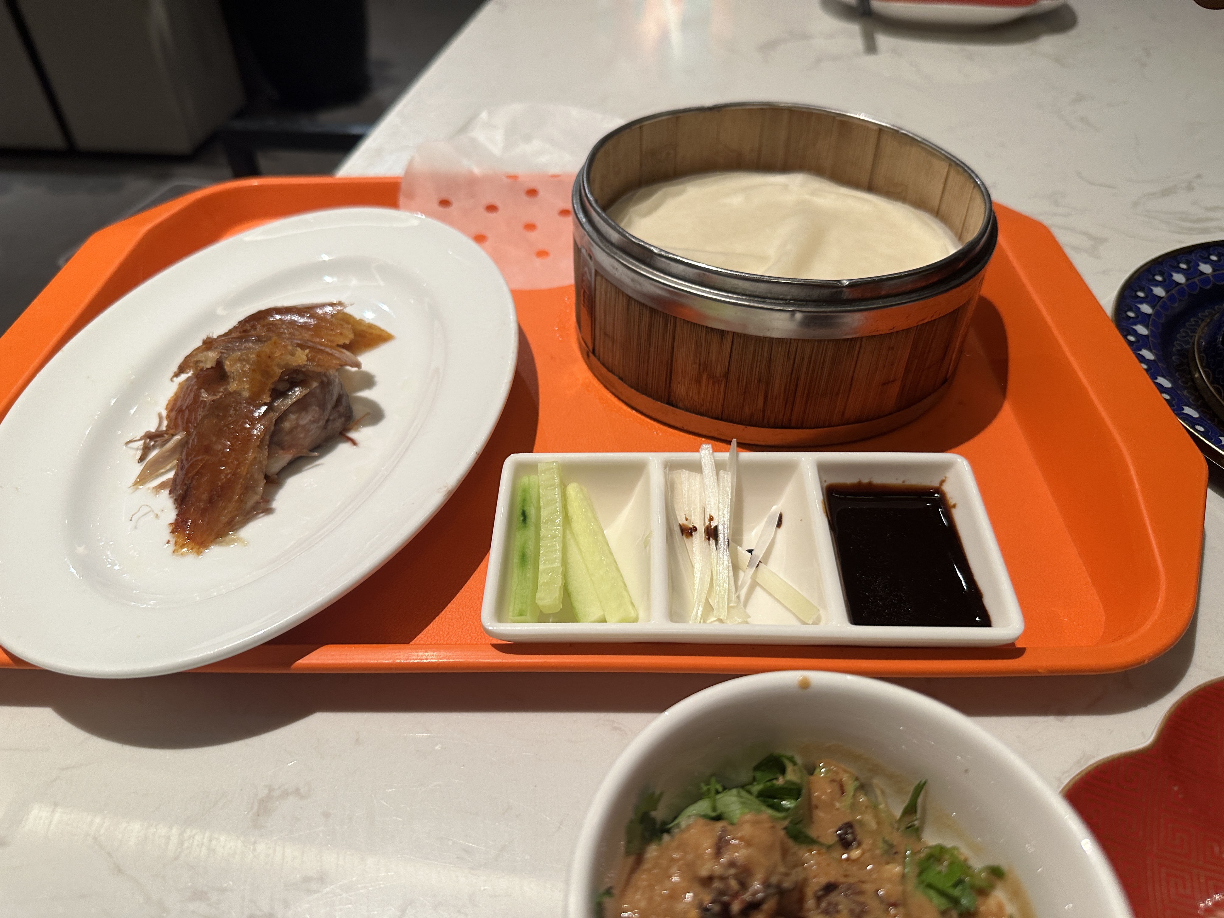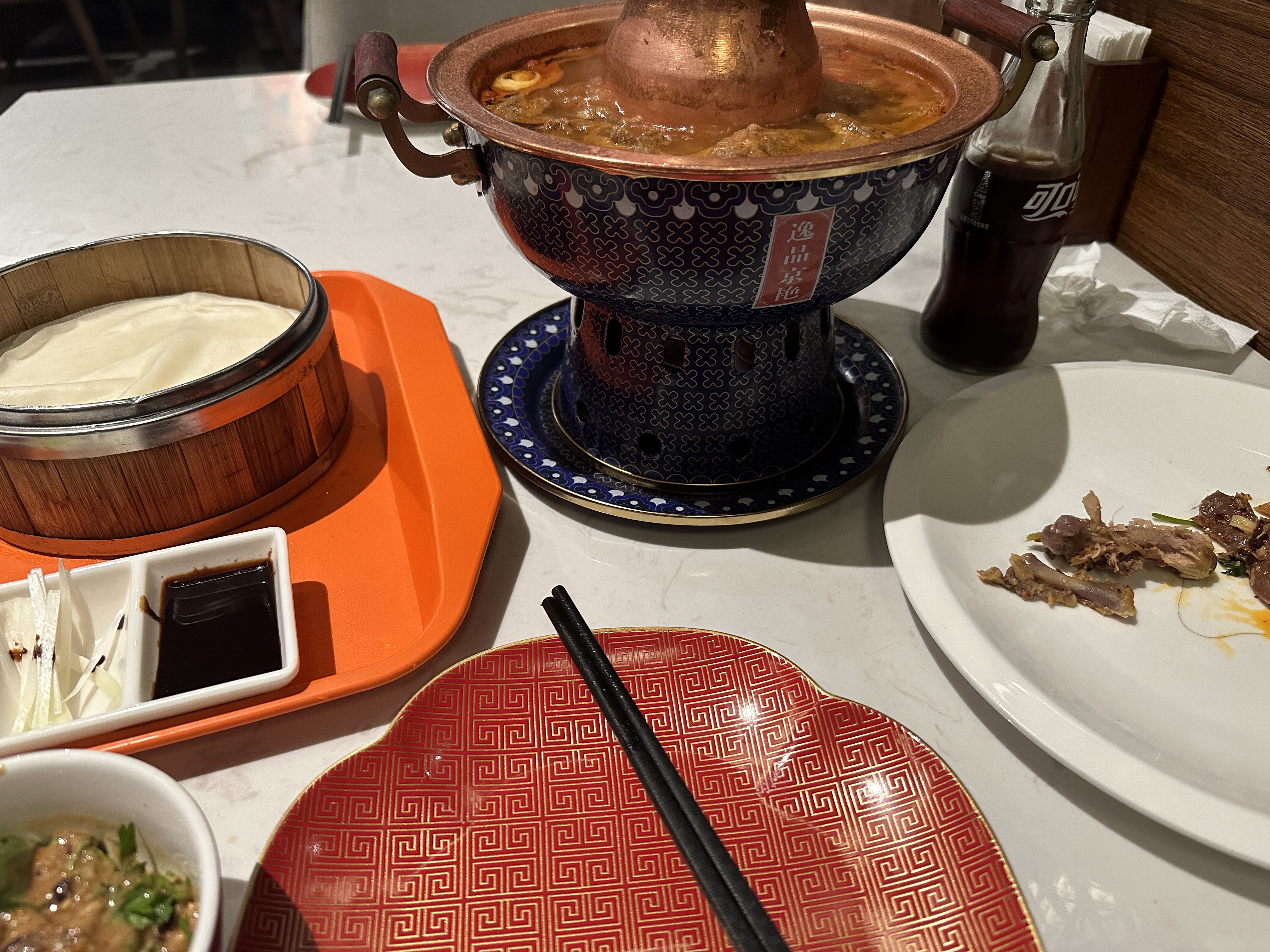 晚上吃的北京烤鸭自助,有一个用煤油烧的小铜锅,烤鸭现烤现切的,服务员也很热情一直关注我的状况随时给我换煤油火和加水,食材种类很多也很新鲜,但就餐环境不咋地,没空调,吃了两轮没啥胃口了,很热,不过胜在性价比高只要128元换算成美金几乎和美国的自助餐差不多,如果好运还能抢到79元的团购卷更具性价比