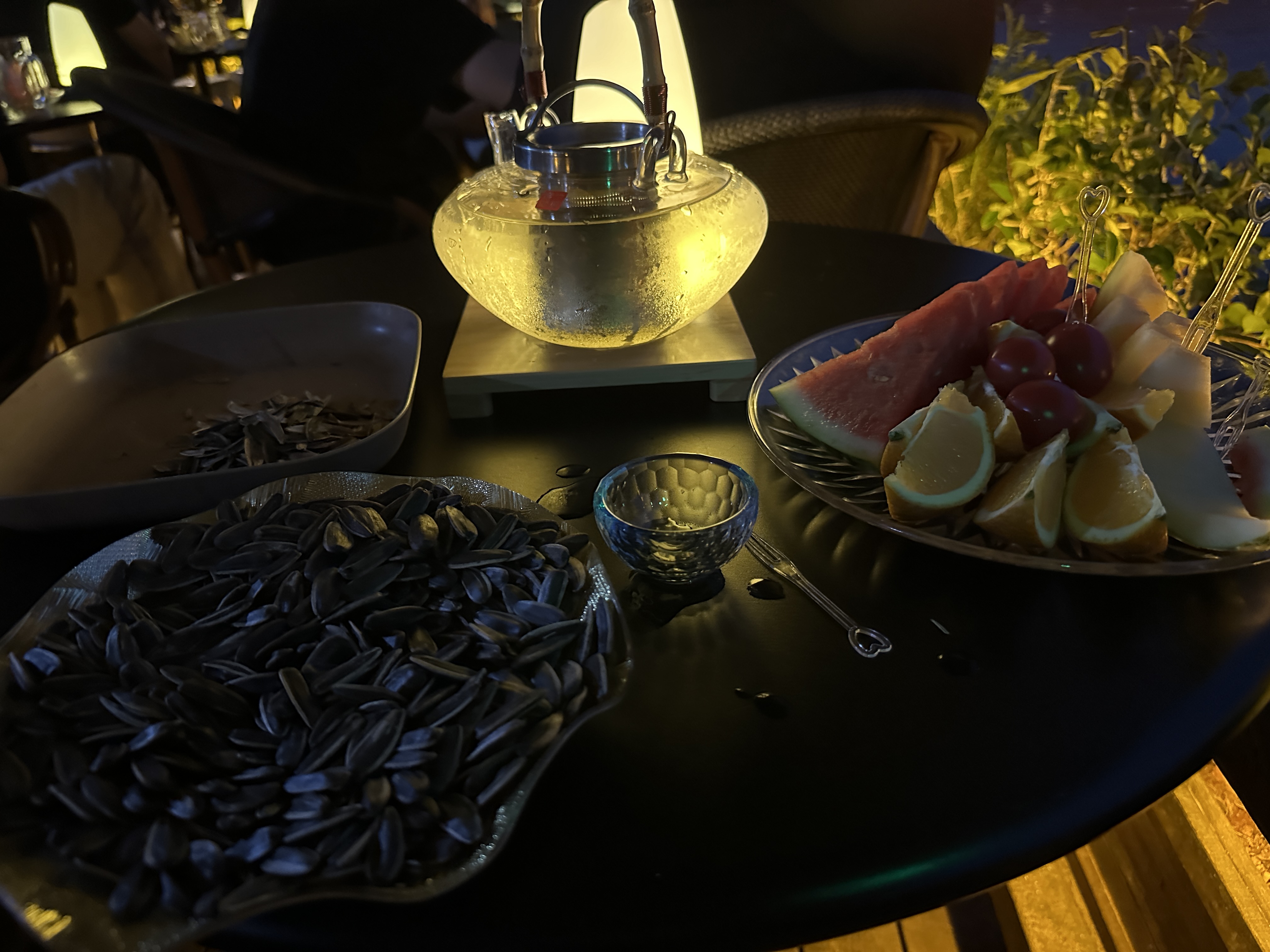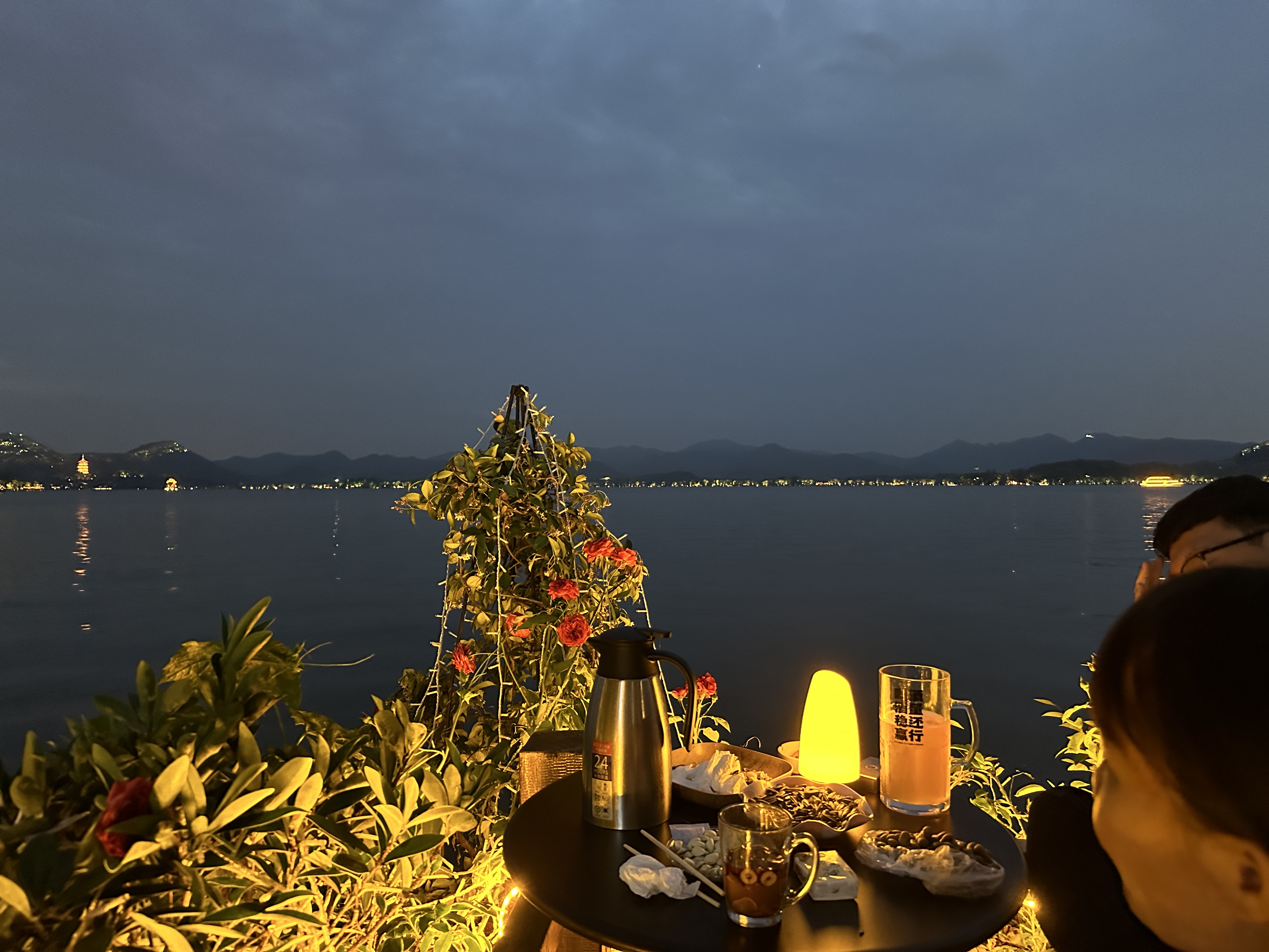 一壶龙井一盘水果瓜子赏西湖
