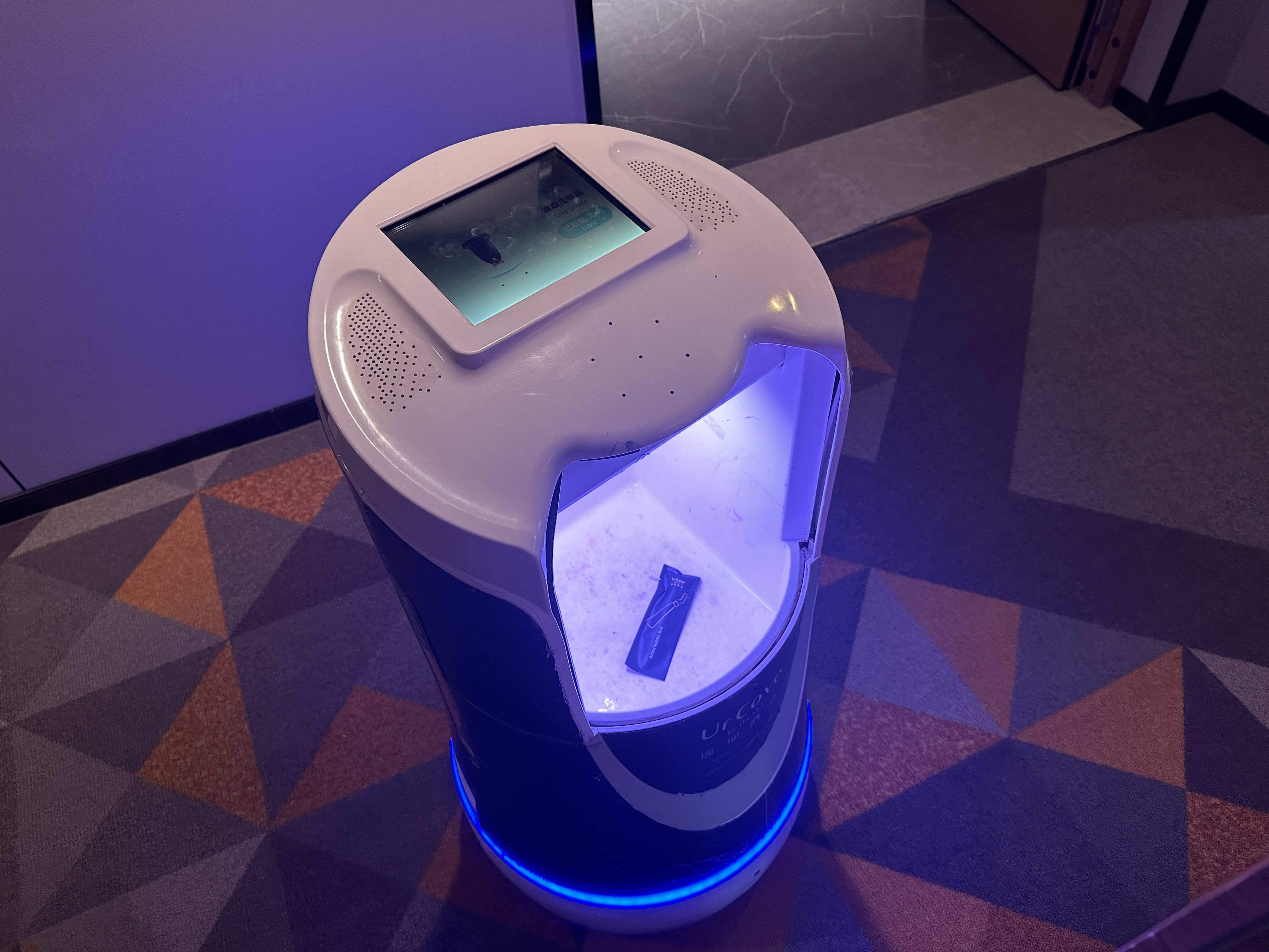 早上叫了客房服务给我送牙膏,过了一阵子客房服务的人给我打电话说东西送到了在门口,当时我还纳闷直接窍门不就行了为啥还要打电话,结果开门看到一个机器人在我面前,用着萌萌的语气对我说牙膏送到了 ![]()