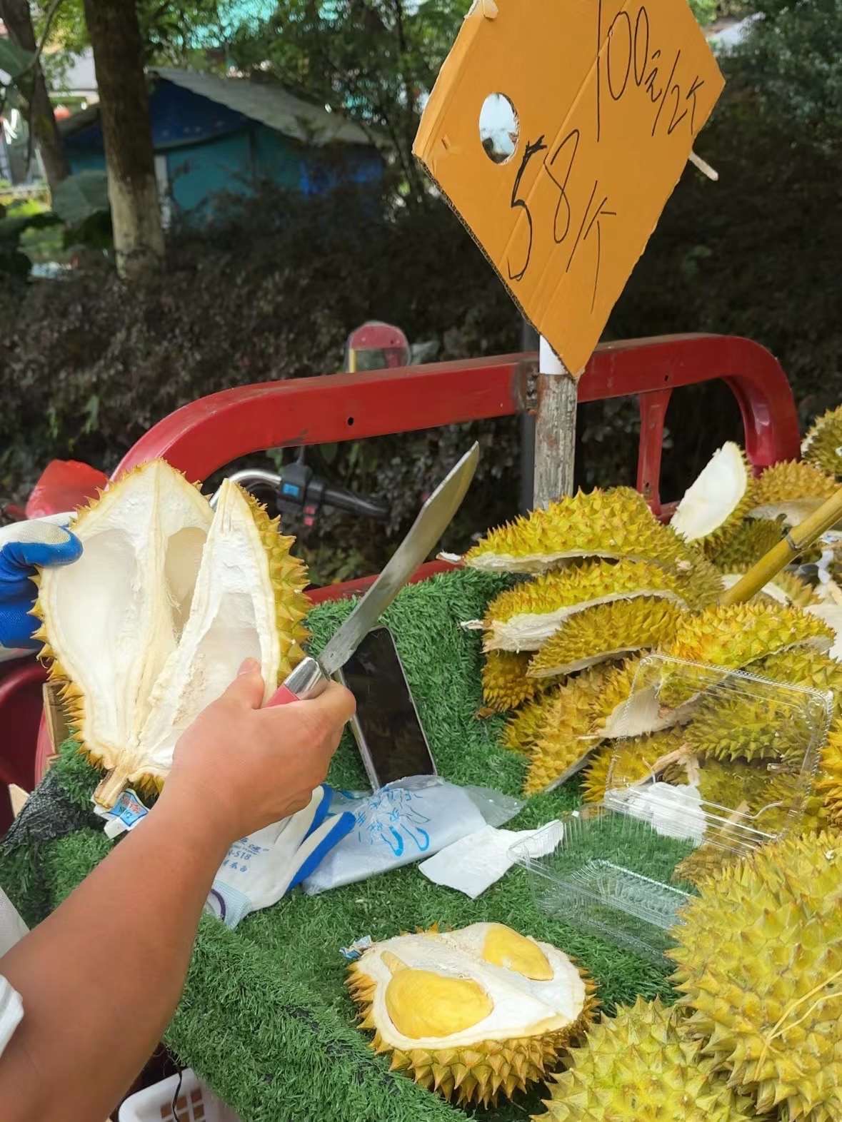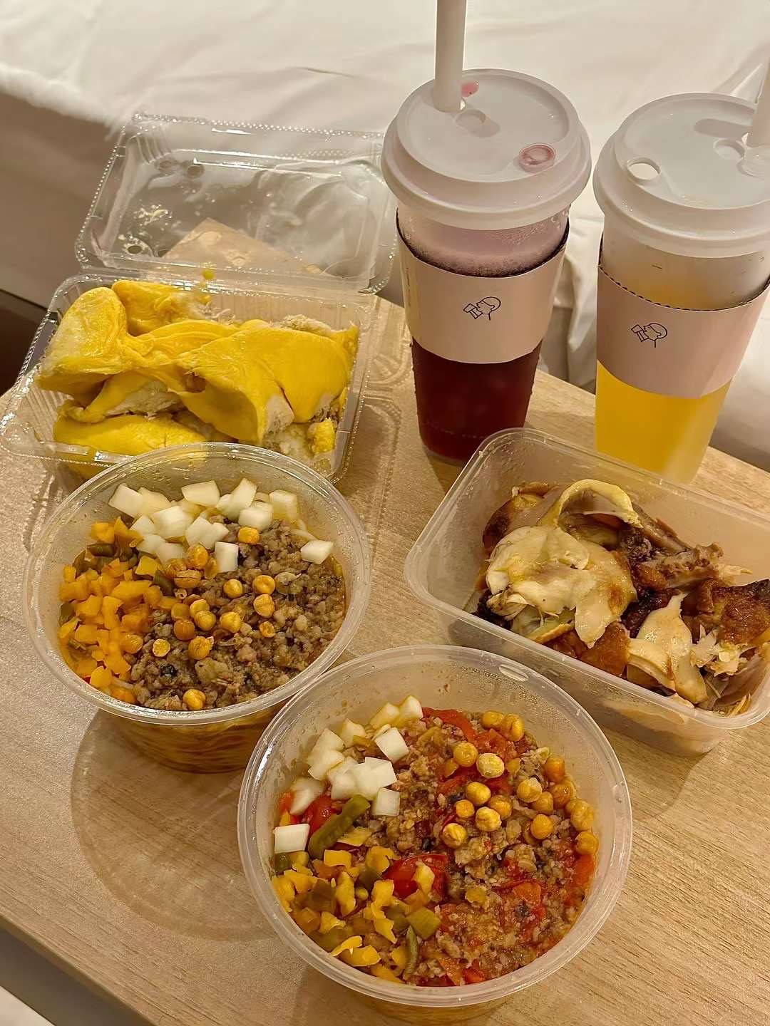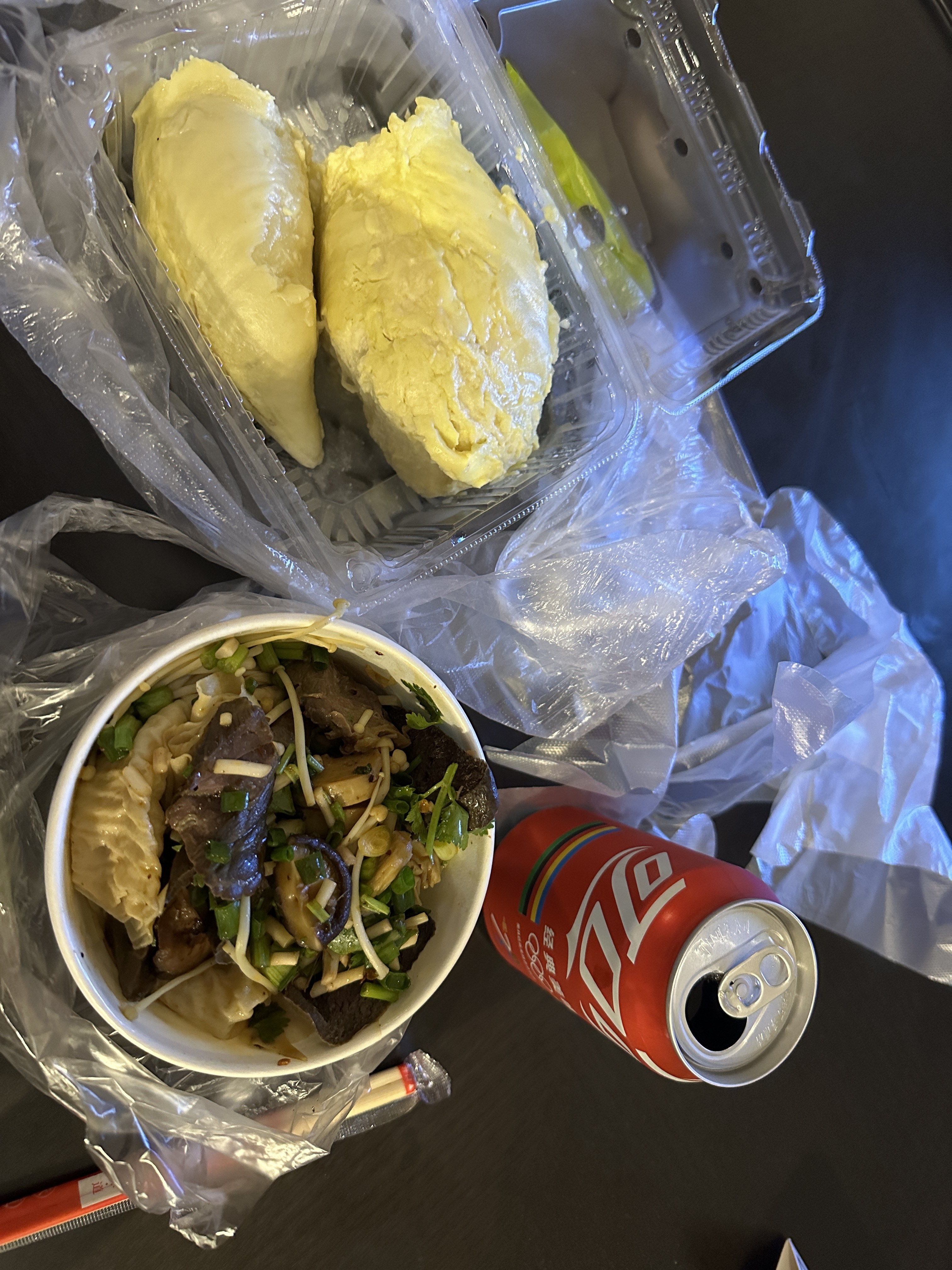 接着在街上买了盒榴莲和一些凉拌回酒店配酒店送我的可乐吃热量炸弹宵夜,今天糖分绝逼超标