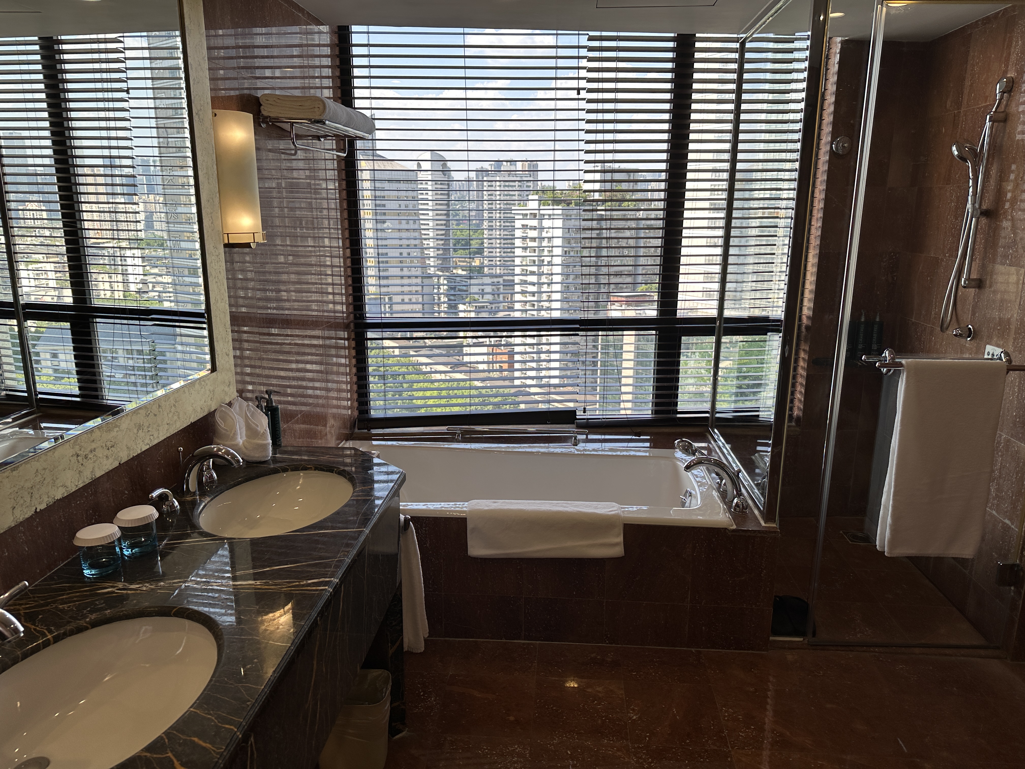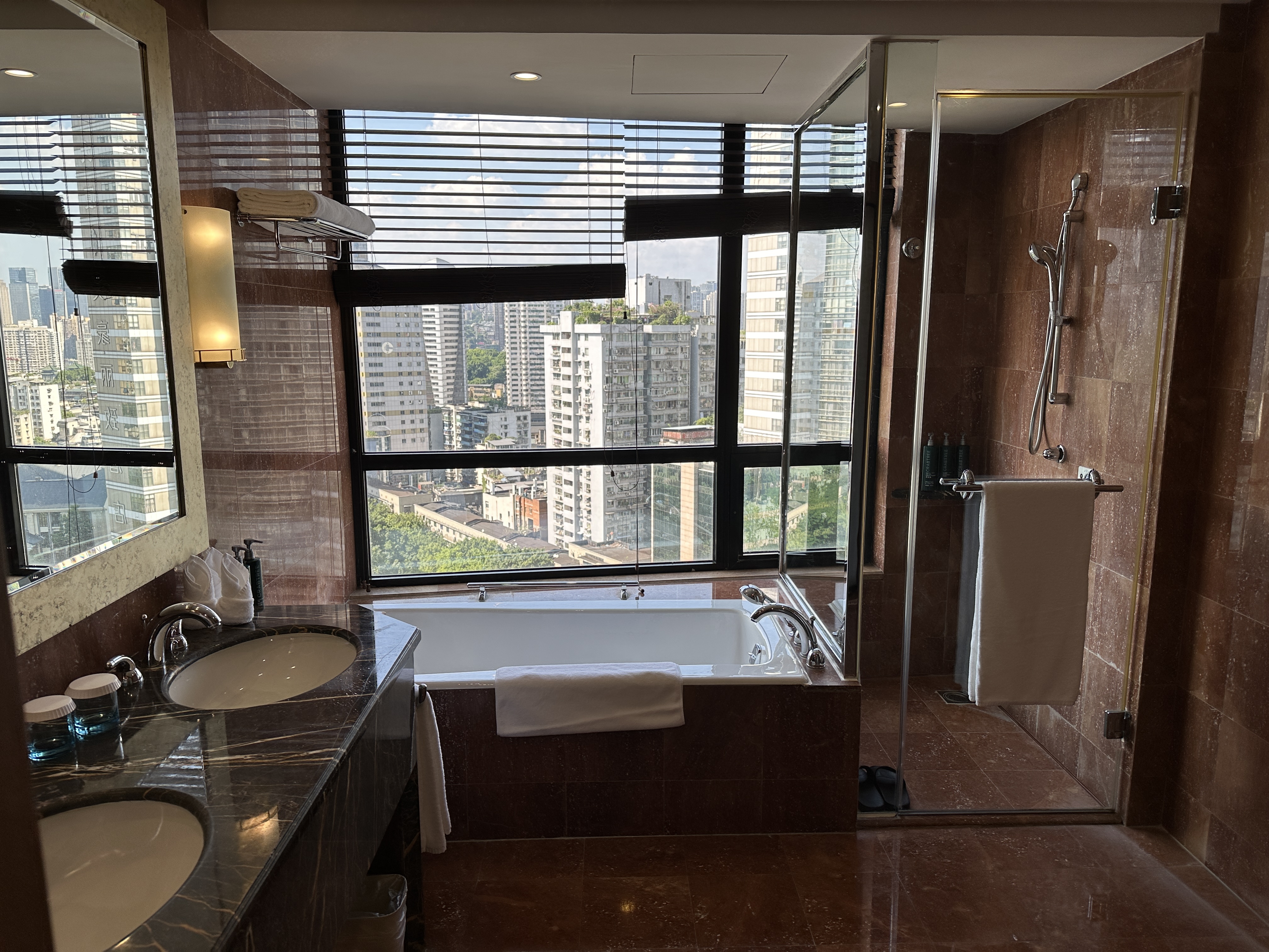 然后又一个闪现昨天到达了重庆,现金入住的渝中区的希尔顿重庆酒店,除了设施老了一点之外服务和其他的都不错,400块钱一晚的价格加上水钻的加持几乎碾压重庆所有酒店,我入住当天前台查到了我是钻就主动把我送上去32楼的酒廊办理入住,我定的是挂壁房酒店主动给我升了个小套,并没有谈心甚至没有主动开口升套 ![]()