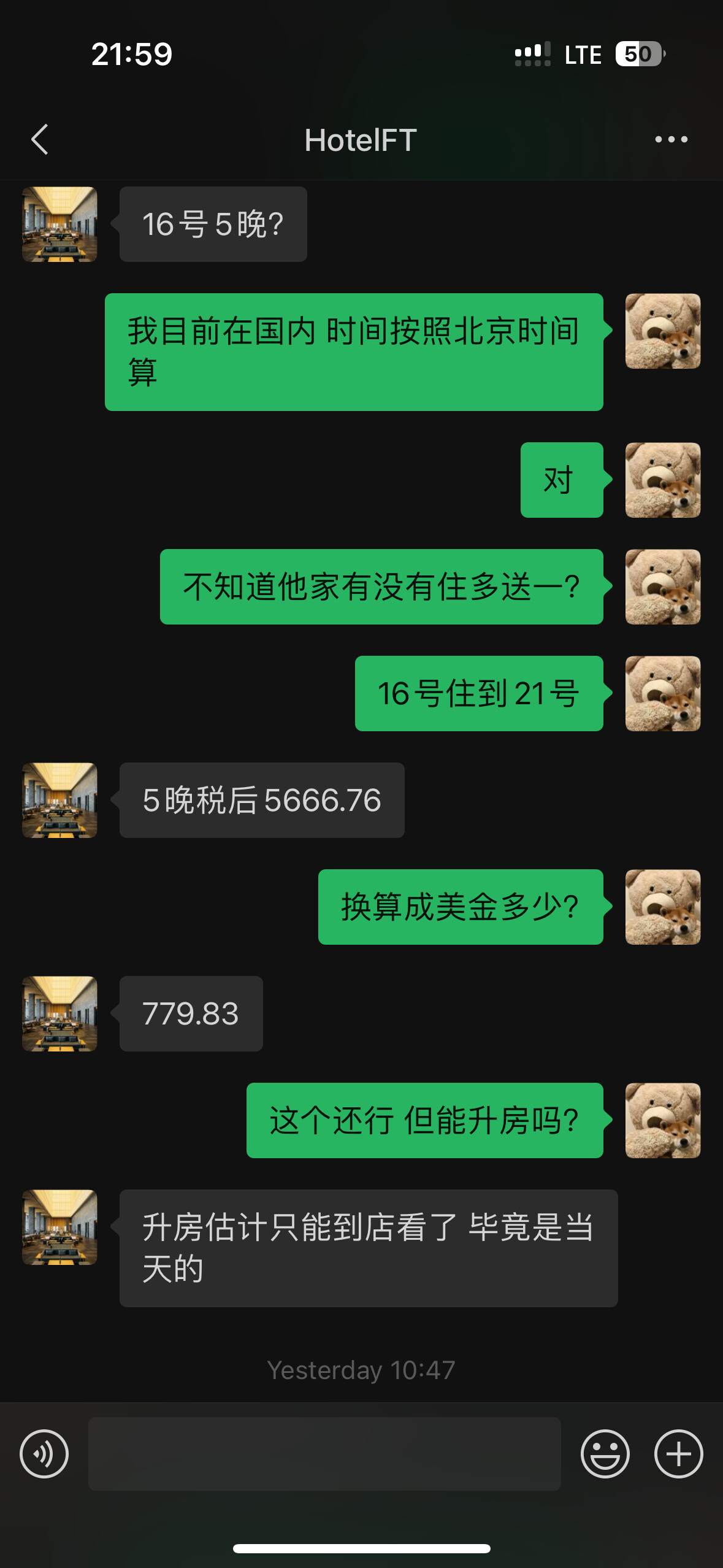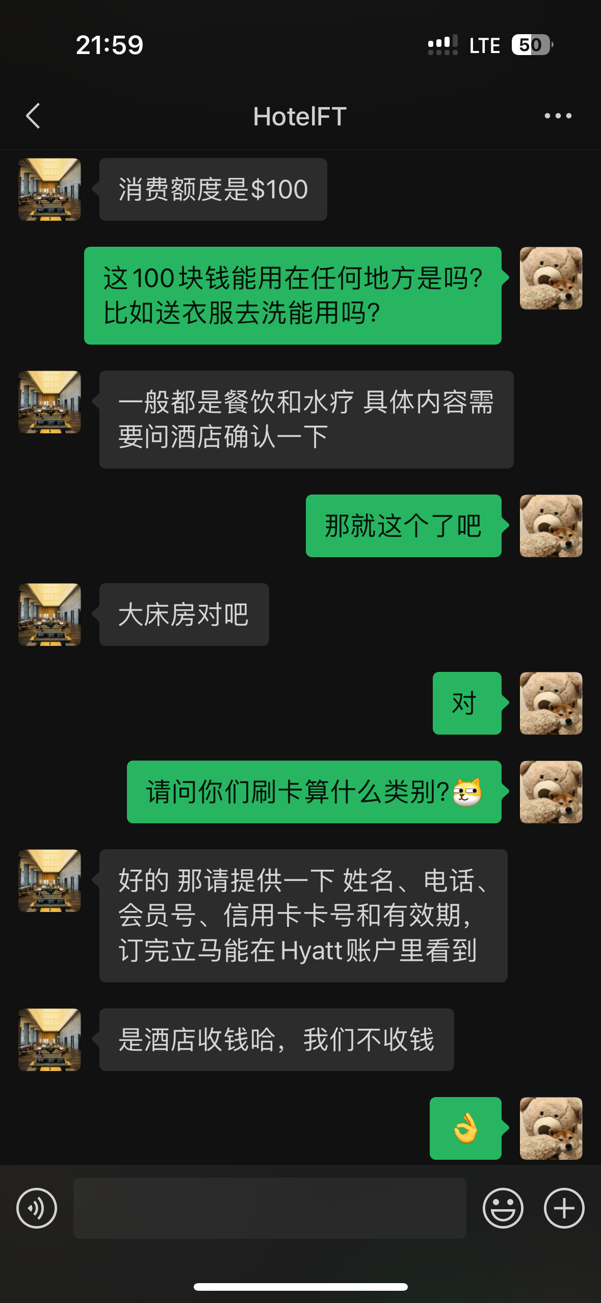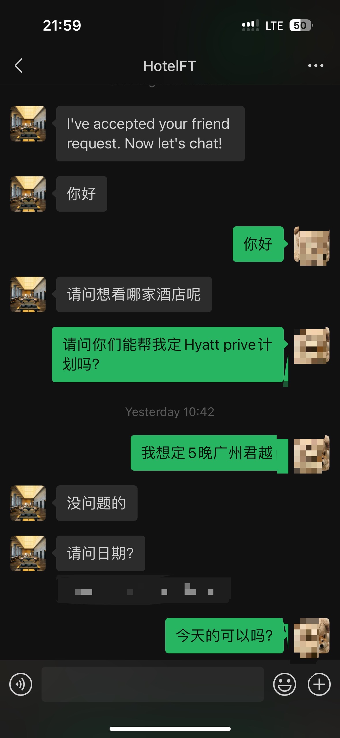因为我只有Hilton的水钻,而Hilton在广州这地方除了康莱德和一家欢朋的位置不错之外其他的都巨偏僻所以我就pass掉了希尔顿,剩下的我就只能现金入住了,当时我果断加上了泥潭HoteITF的微信果断用Hyatt Prive定了富力君悦五晚现金大床房