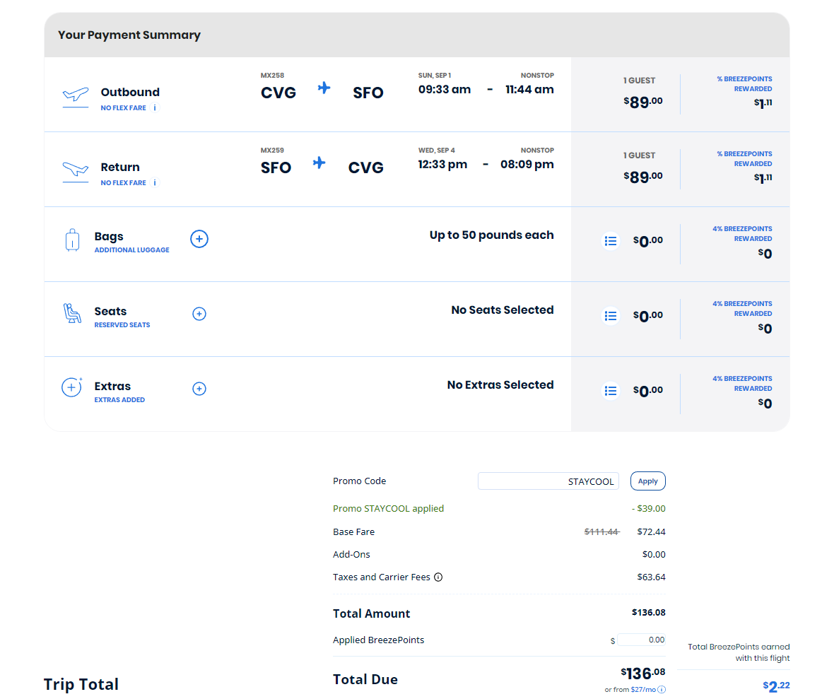 *35% base fare discount applies only to new reservations for round-trip flights with promo code STAYCOOL. Supply is limited, and no advance purchase requirement applies. Promotion must be purchased at flybreeze.com or on the Breeze app from June 4, 2024, through June 5, 2024 (11:59 pm PT), for travel on August 13, 2024, through November 13, 2024. Promotion excludes travel on September 2, 2024, October 6, 2024, October 13, 2024, October 20, 2024, and October 27, 2024. Travel must be flown on qualifying travel dates for discount to be applied in full. The discount will apply only to flights on qualifying travel dates. All fare rules will apply. Certain flights and/or days of travel may be unavailable. Fare prices, fare classes, rules, routes, and schedules are subject to change or exemption without notice. Cannot be combined with any other offer. Any changes or modifications to qualifying promotional reservations will be subject to fare repricing. A difference in airfare at the current fare price may apply. Offer not valid on group bookings. Other restrictions and blackout dates may apply.