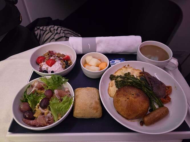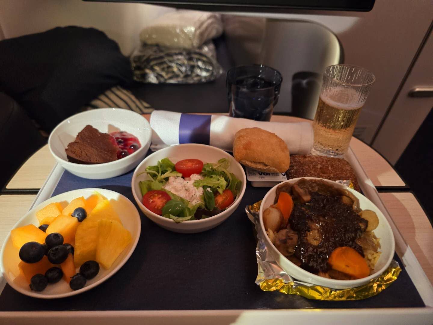 飞往上海的航线上提供中文菜单。说是Lightmeal但其实也是热食,只不过分量比较有限。楼主选了beef burgundy stew with rice,评价是和Lounge的北欧菜比起来简直是高到不知道哪里去了。