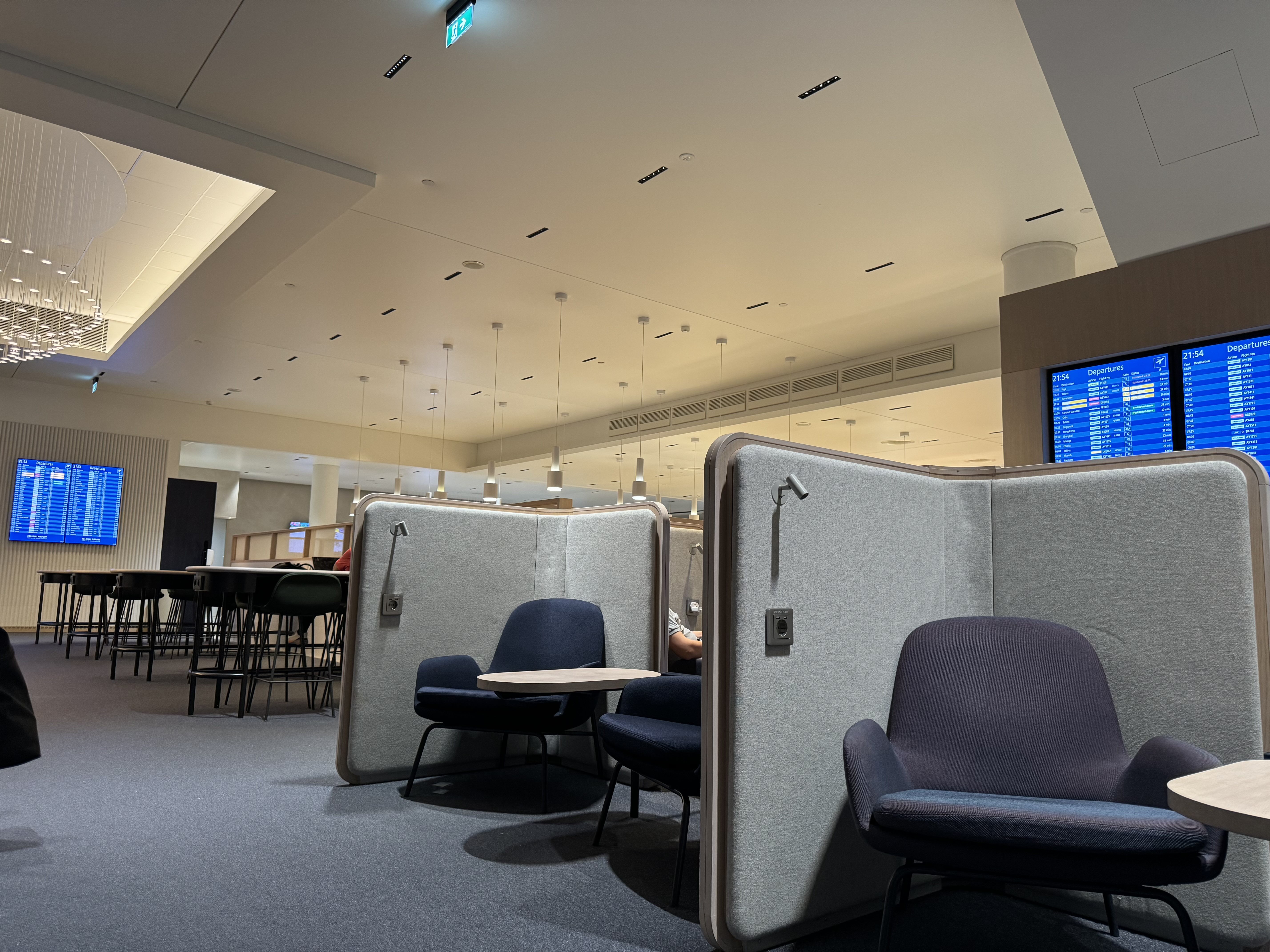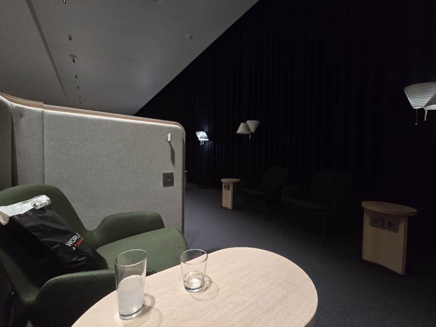 整个Lounge都是典型的北欧性冷淡风格,除开用餐的桌子和Bar台,其余大量的空位都是社恐友好的单人半包围座位,在休息室的边缘更是提供了许多灯光昏暗的沙发角,完全是社恐的天堂。此外还设置有专门的电话/solo间,自闭到完全不想见人的旅客也有适合自己的位置。