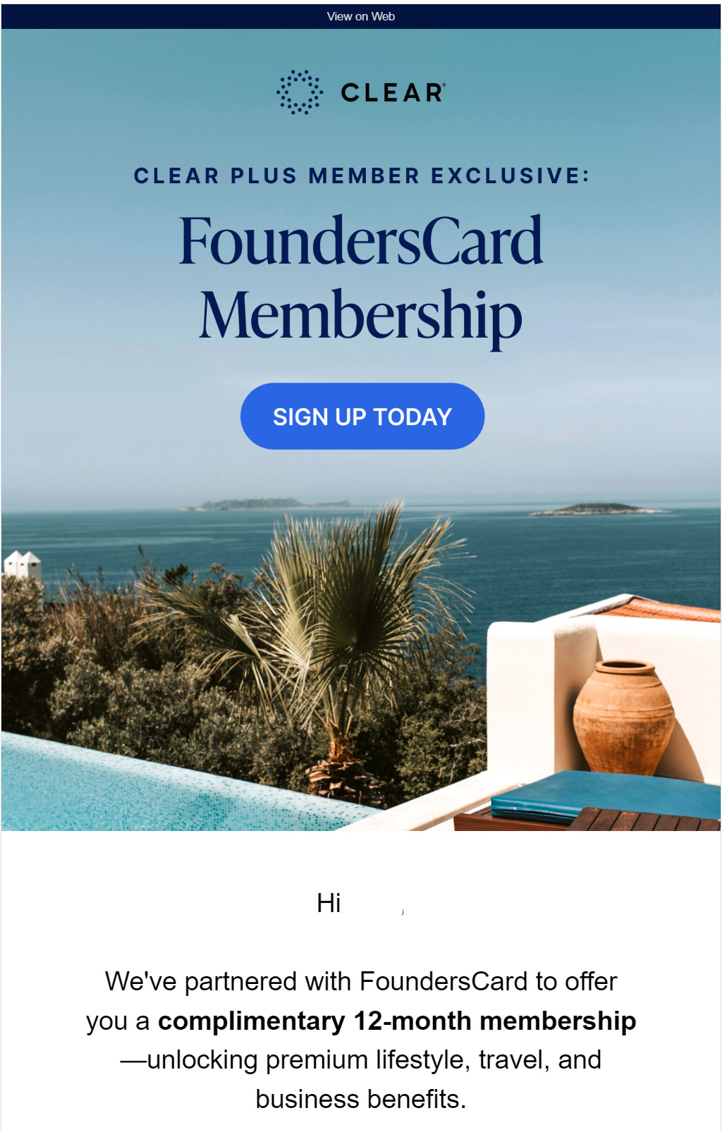 今天收到邀请 本身是AMEX白金薅的CLEAR+ 似乎一年的FoundersCard可以薅一些额外的航空公司酒店租车的高等级