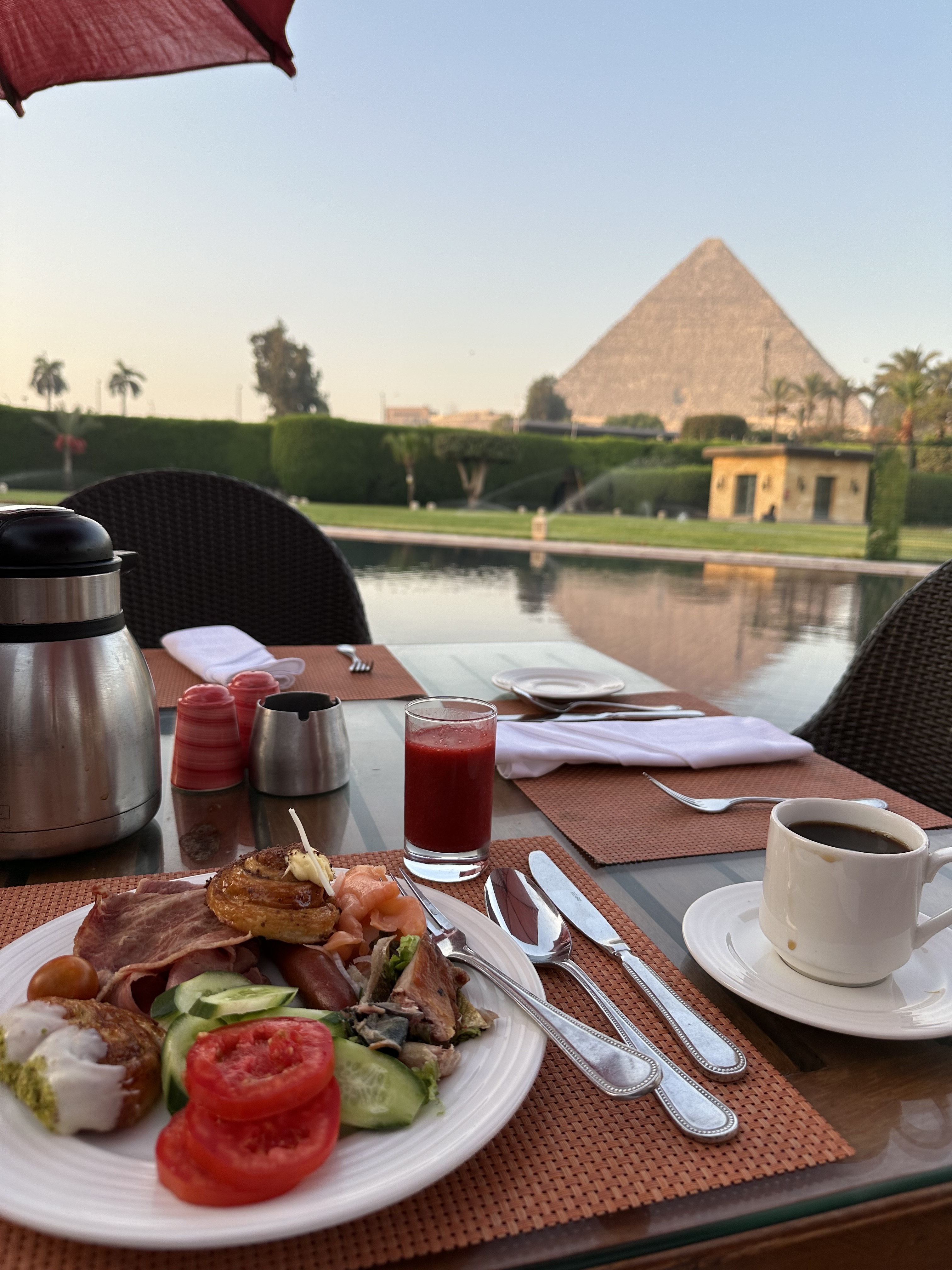 第二天早起准备趁骗子们还没上班进去金字塔hike然后中午前出来洗个澡再checkout。金字塔景早餐体验非常优秀