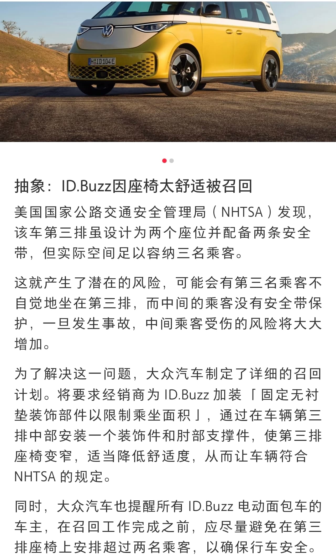 大众商用车部门发言人托比亚斯·里佩(Tobias Riepe)向法新社表示:“没有电动ID。由于美国当局强制要求技术召回,汉诺威生产的Buzz车型目前正在运往北美。”