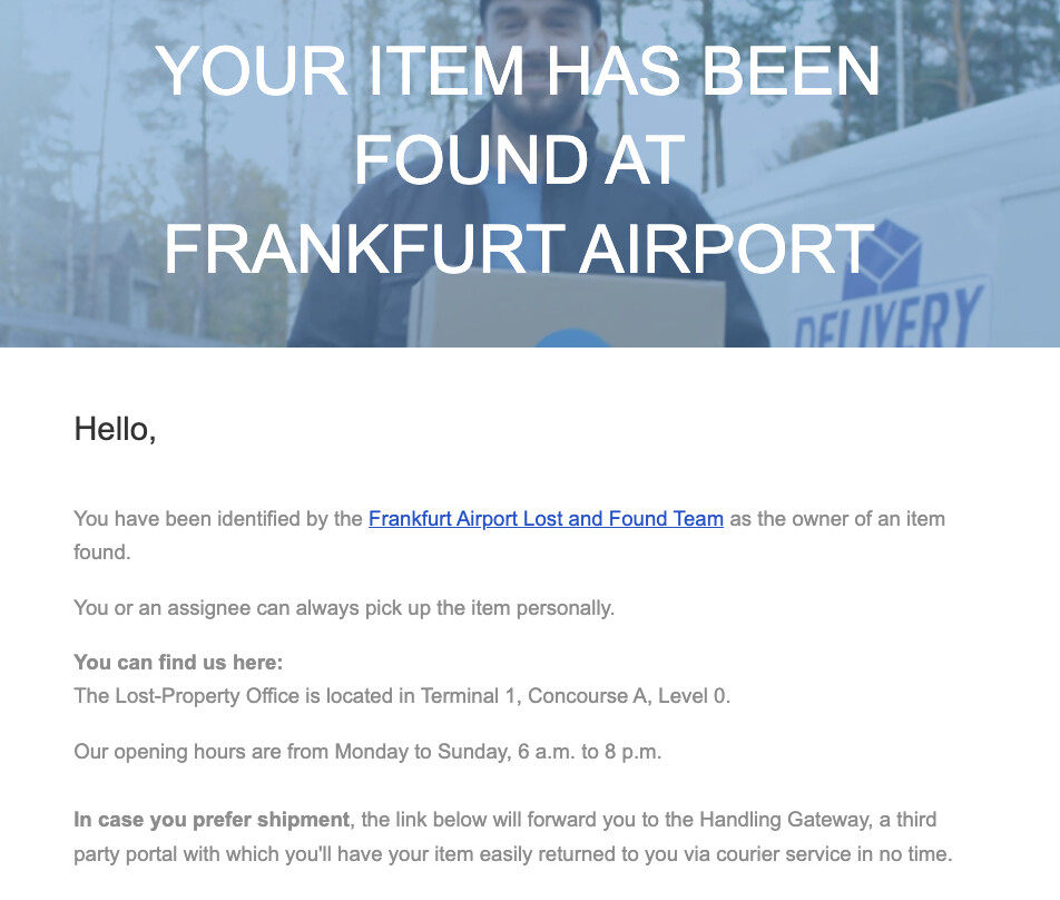 果然,星期一FRA当地时间1:30pm 收到了邮件。我怀疑这些都是每天统一送出的,1:30pm过于巧合。可以自己pick up,但我下次去frankfurt最早也要是8月了。他们说2个月不拿走就会销毁。
