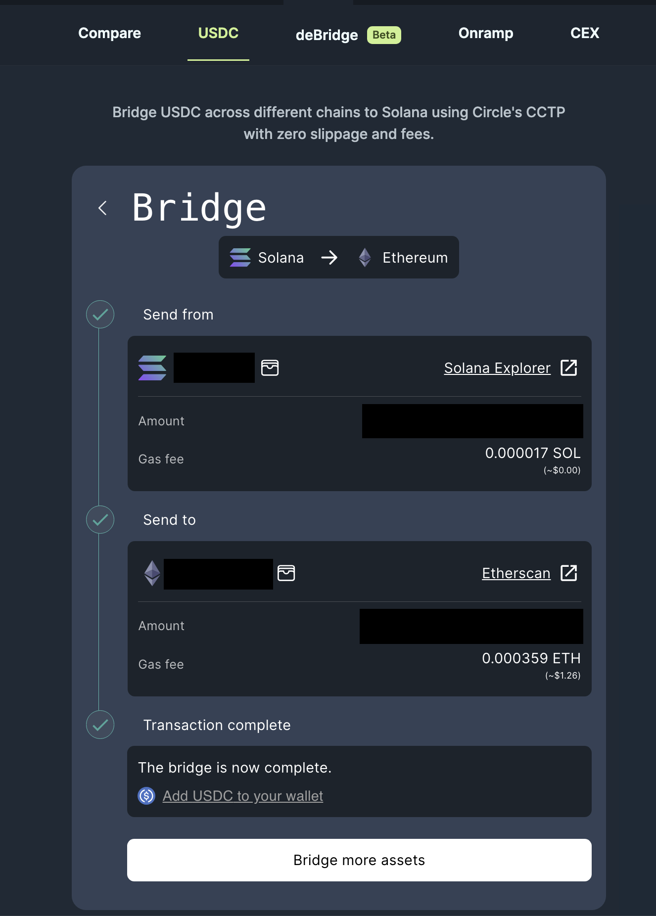 第五步,在点击Solana,进入deBridge,选择Sol链的USDT/USDC,换成ETH链的USDT/USDC