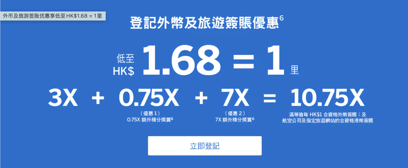 - 报名优惠 2: 2025上半年,在指定航司和OTA名单消费,每一港币多给 7X(季度10000HKD)
