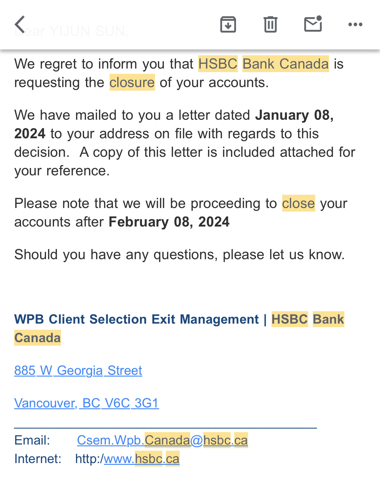 Mar HSBC US chequing and credit card accounts closure notification (closed in May)