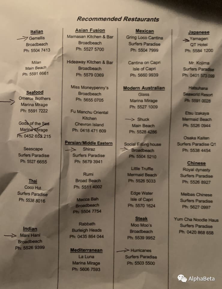 3. 黄金海岸。 这里其实不太好找餐厅,大众点评在海外的覆盖和更新已经完全落后了,只能通过小红书搜索,幸运的是这次住的万豪度假村,提供了一张度假餐饮清单,聚集了整个黄金海岸的美食,且我还让工作人员进行了单独推荐,经过打卡发现有2家还是很不错的,一个是泰国菜 cocohut, 一个是当地特色猪排/牛排 the hurricanes: