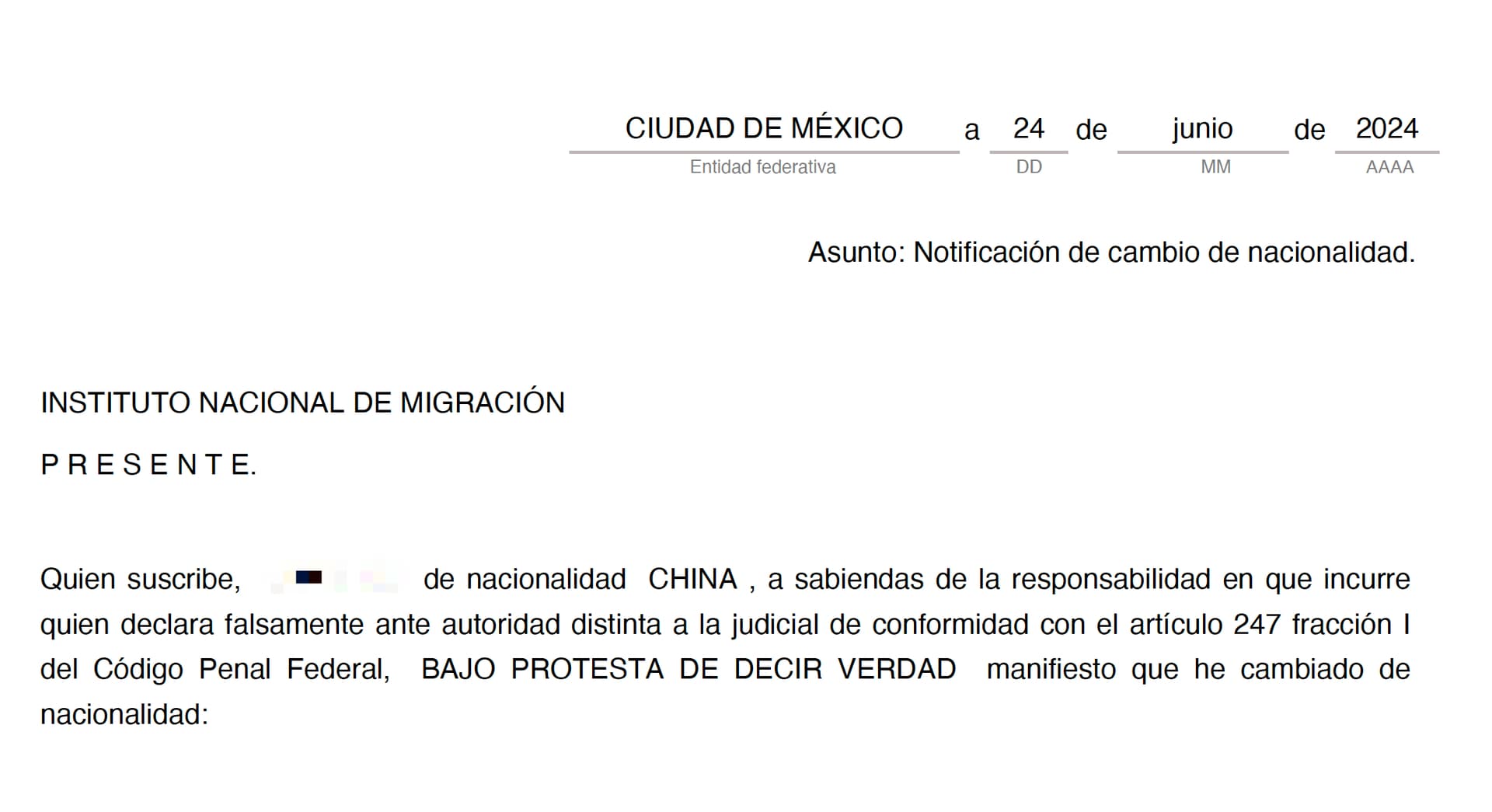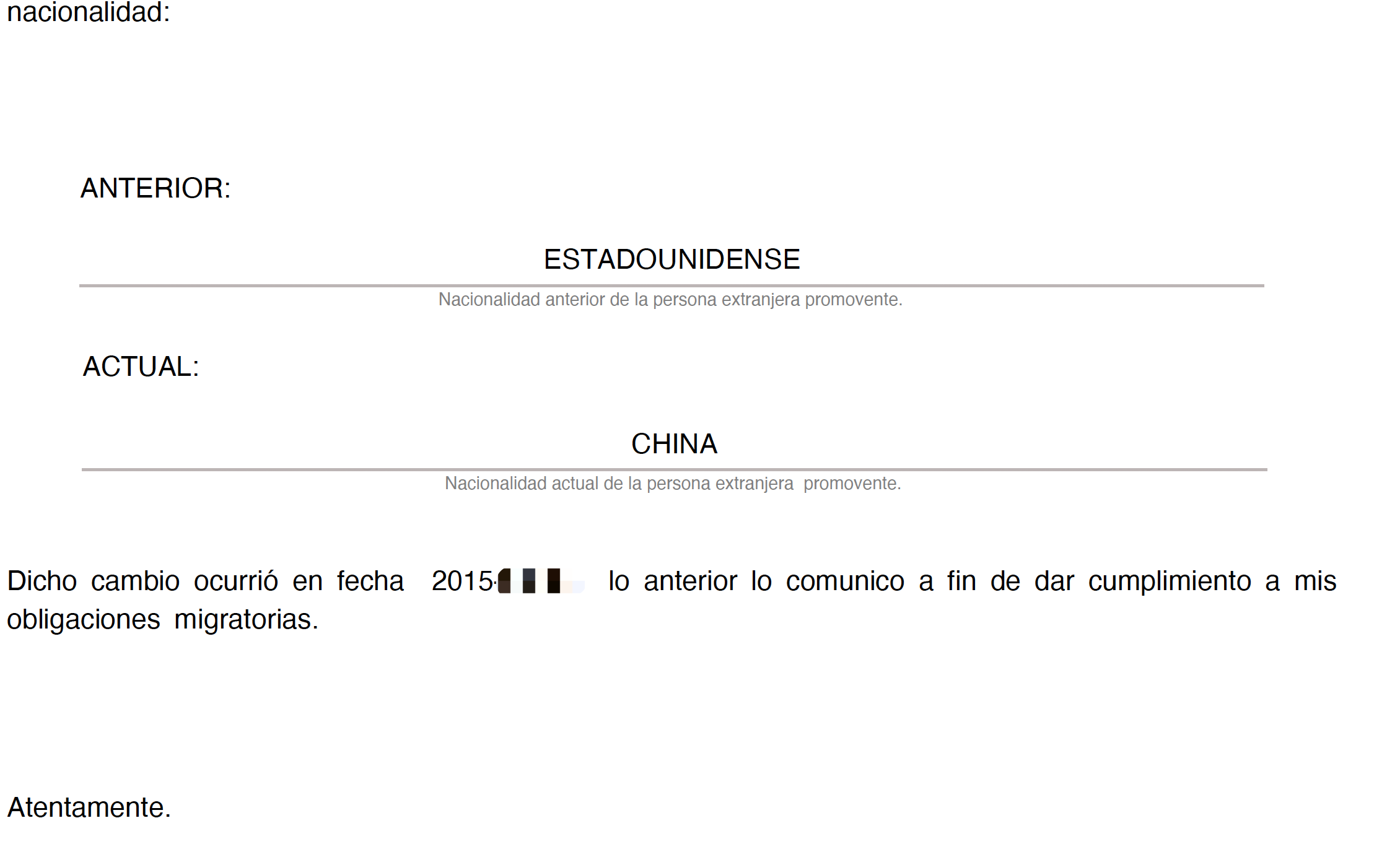 自述国籍变更签字页(Carta para notificar cambio de nacionalidad)【这张表填写要注意的地方我等下po图解释。】
