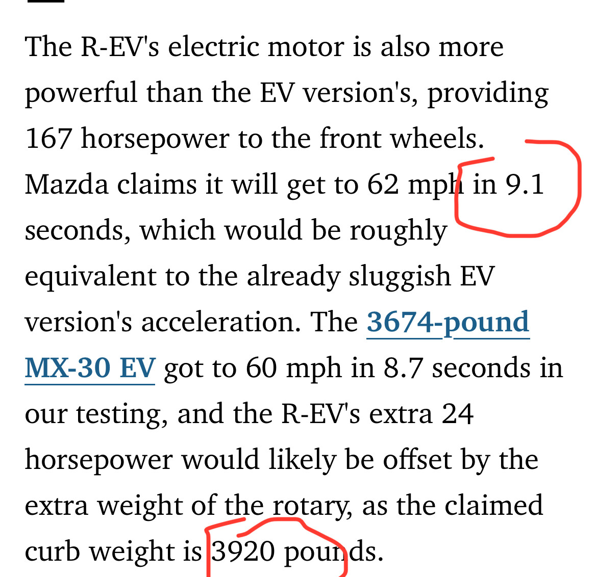 我看楼上发的 MX-30 R-EV 重量还可以啊, 比EV版的多了250lbs, 电池彻底没电也可以做到32mpg