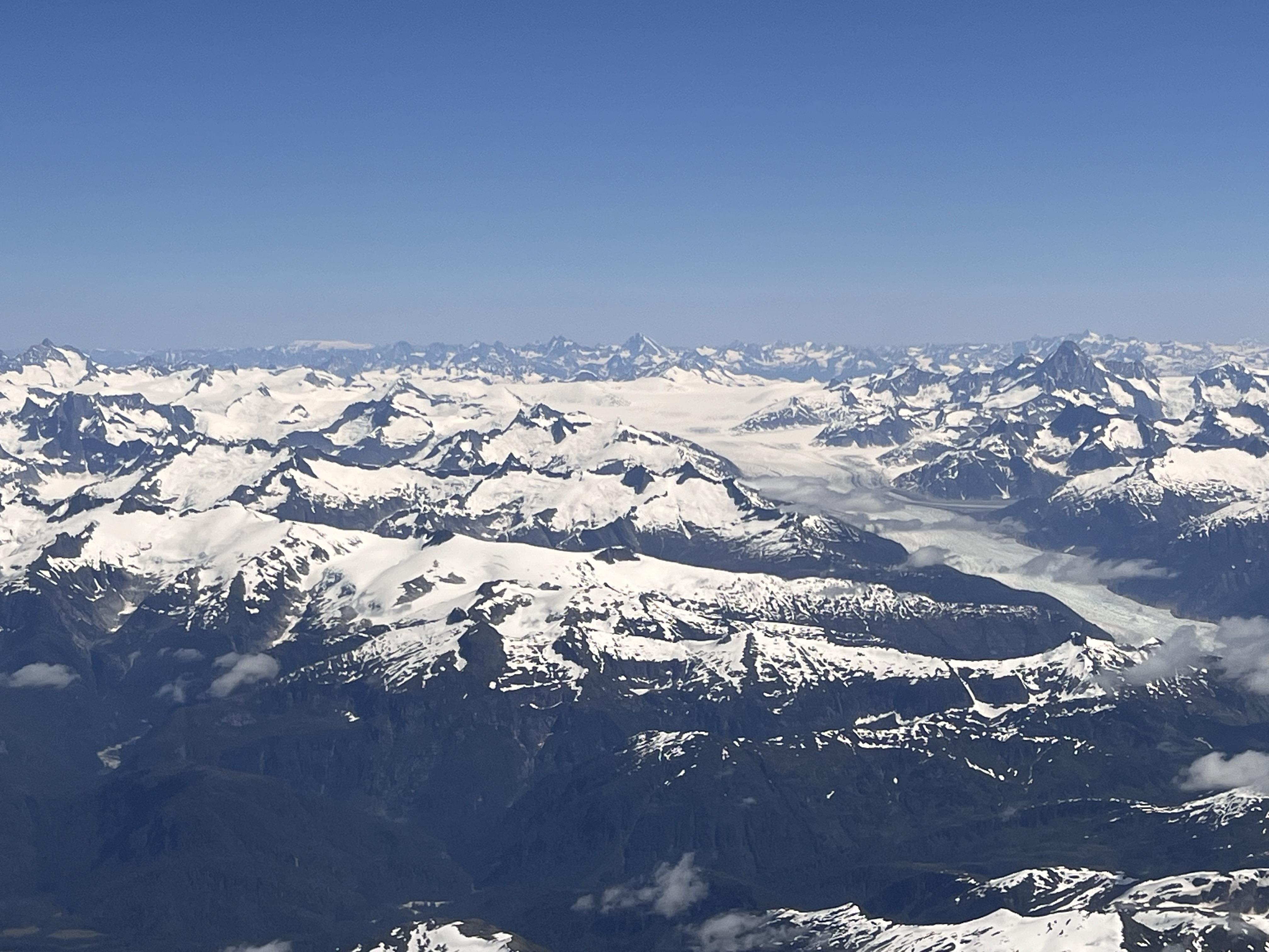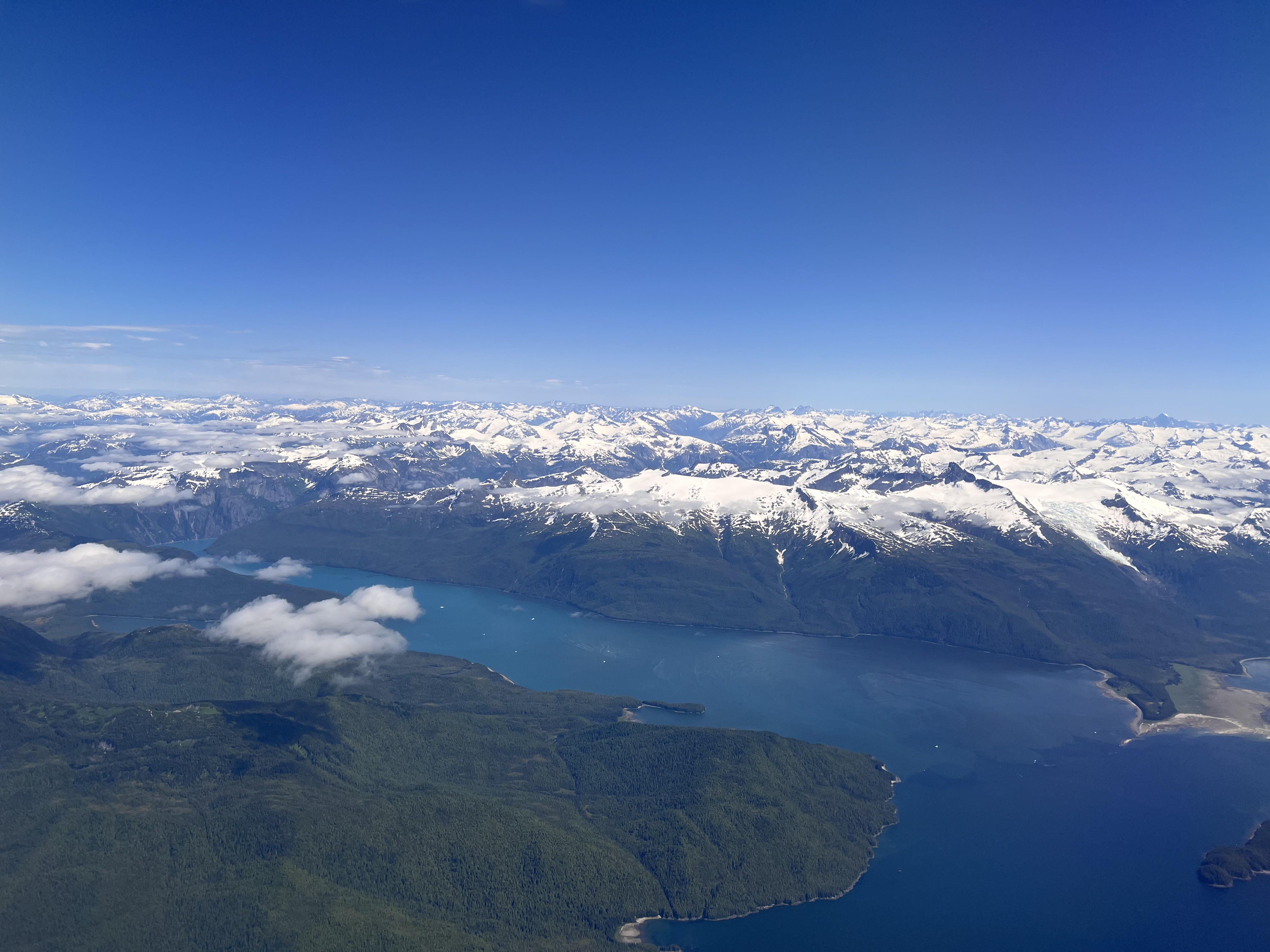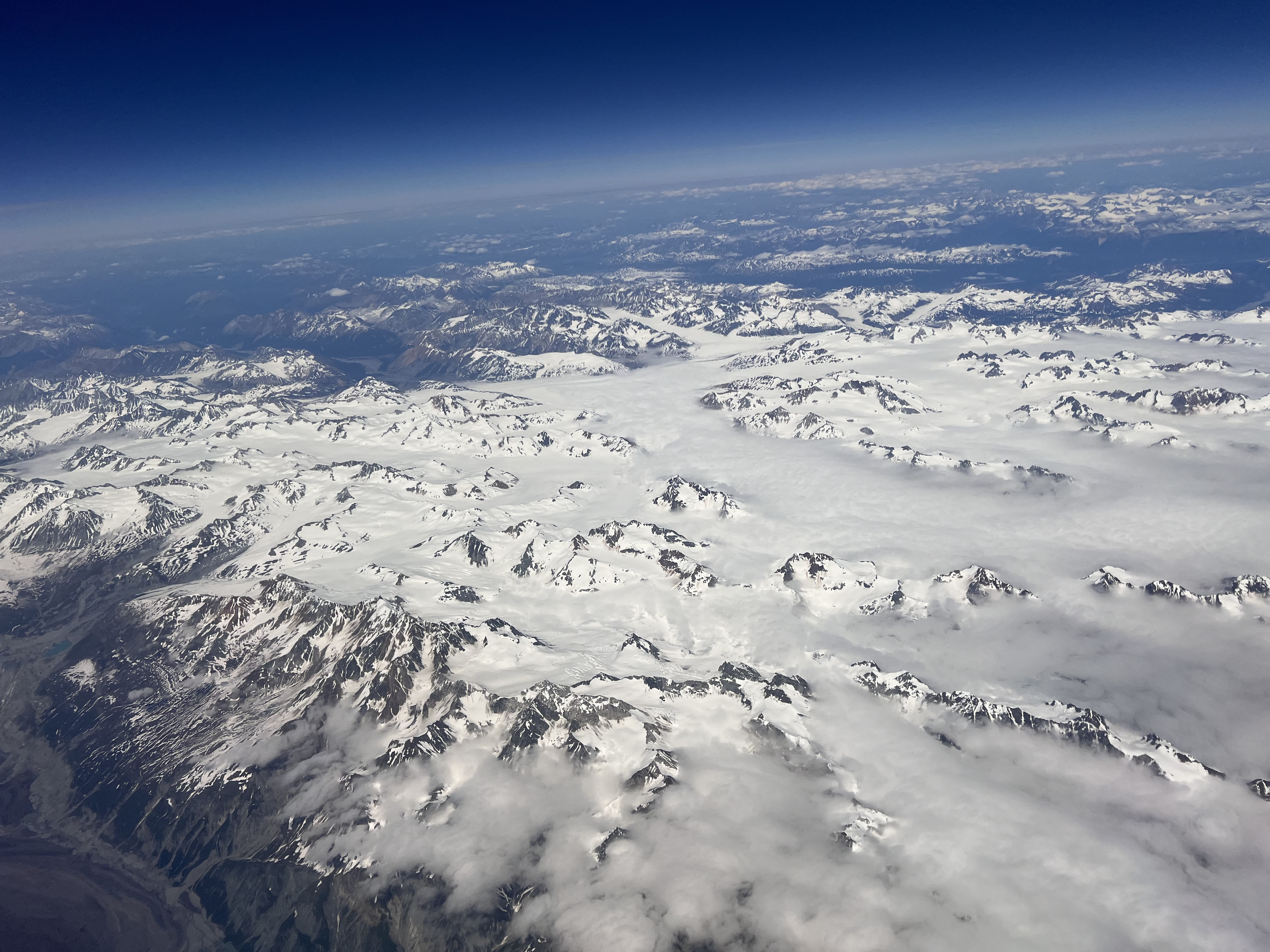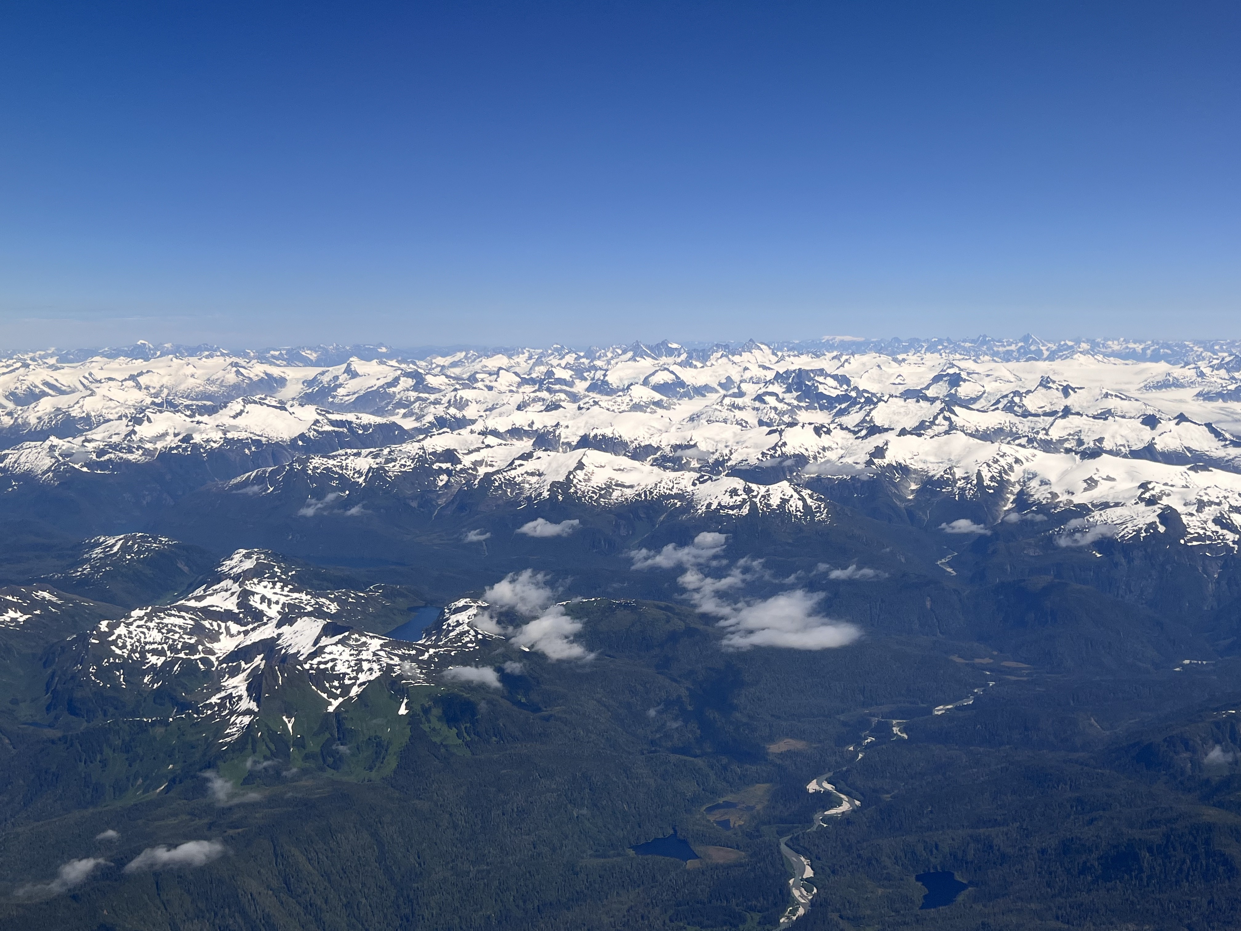 这一段云比较多,但雪山还是看得很清楚。快到ANC的时候一片碧绿。
