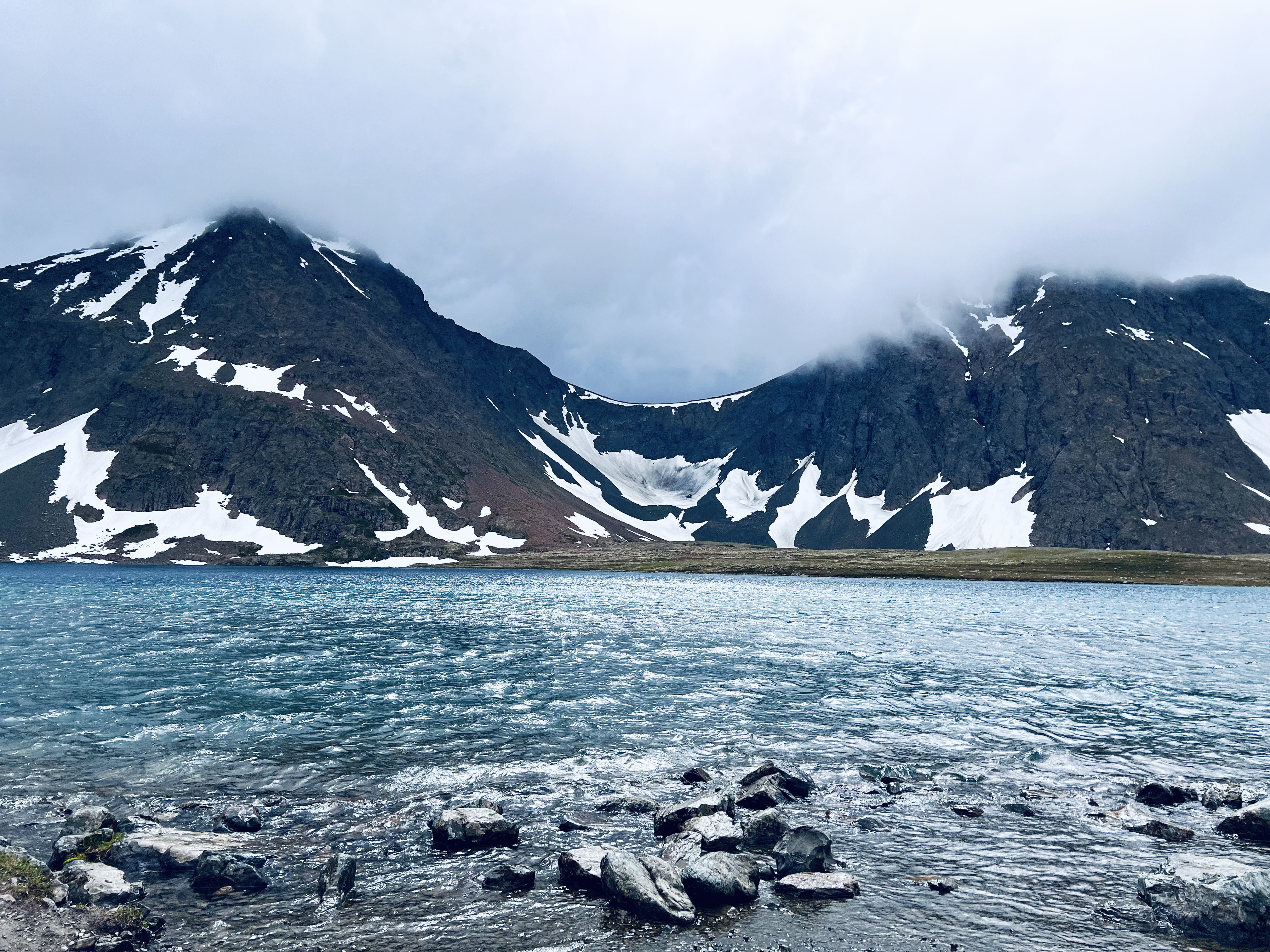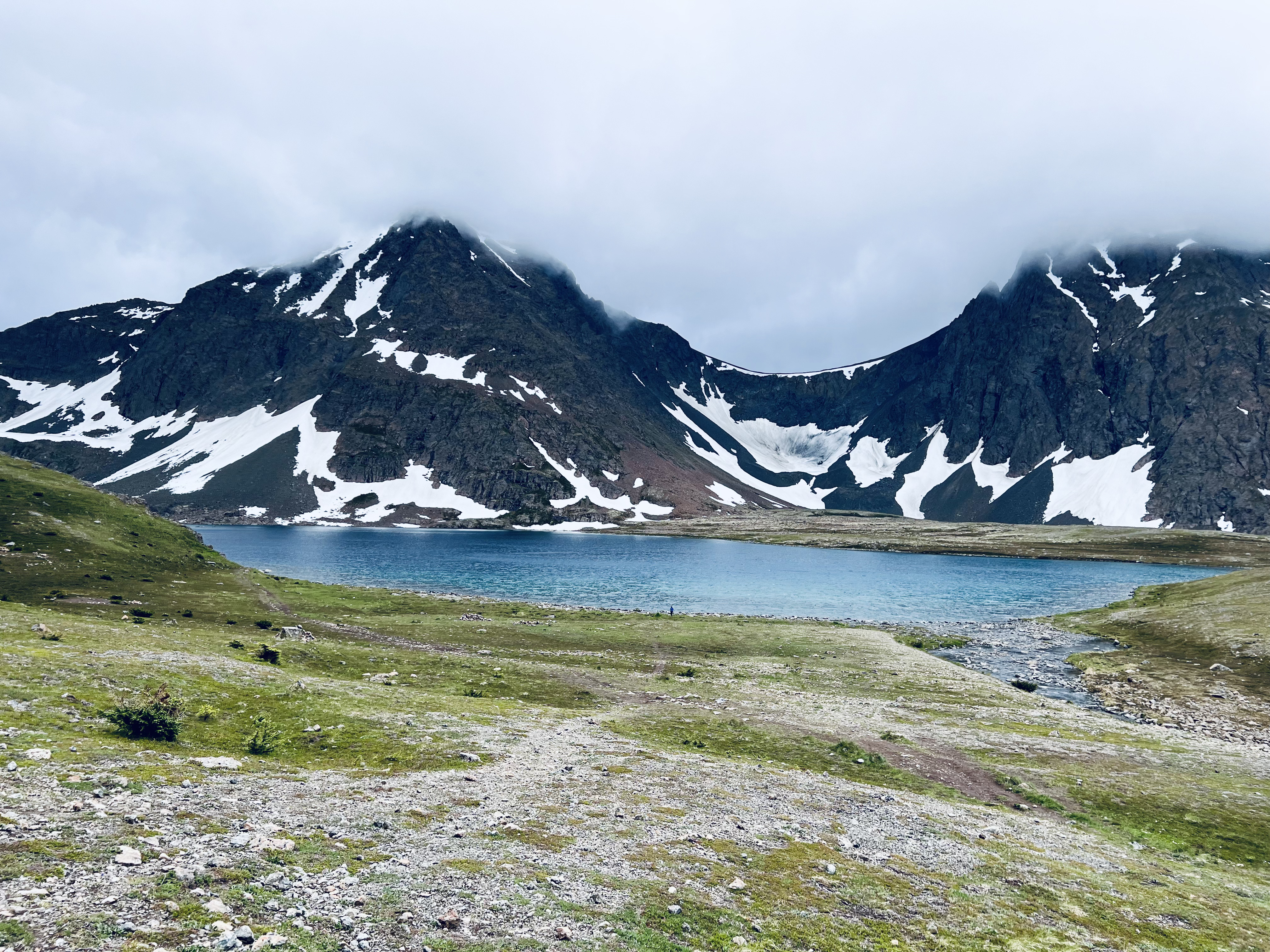 这条trail在flattop南边一点,和flattop比雪多一些。6月底的时候路上还有积雪。现在虽是7月,但大风加上低温,可能还需要羽绒服。
