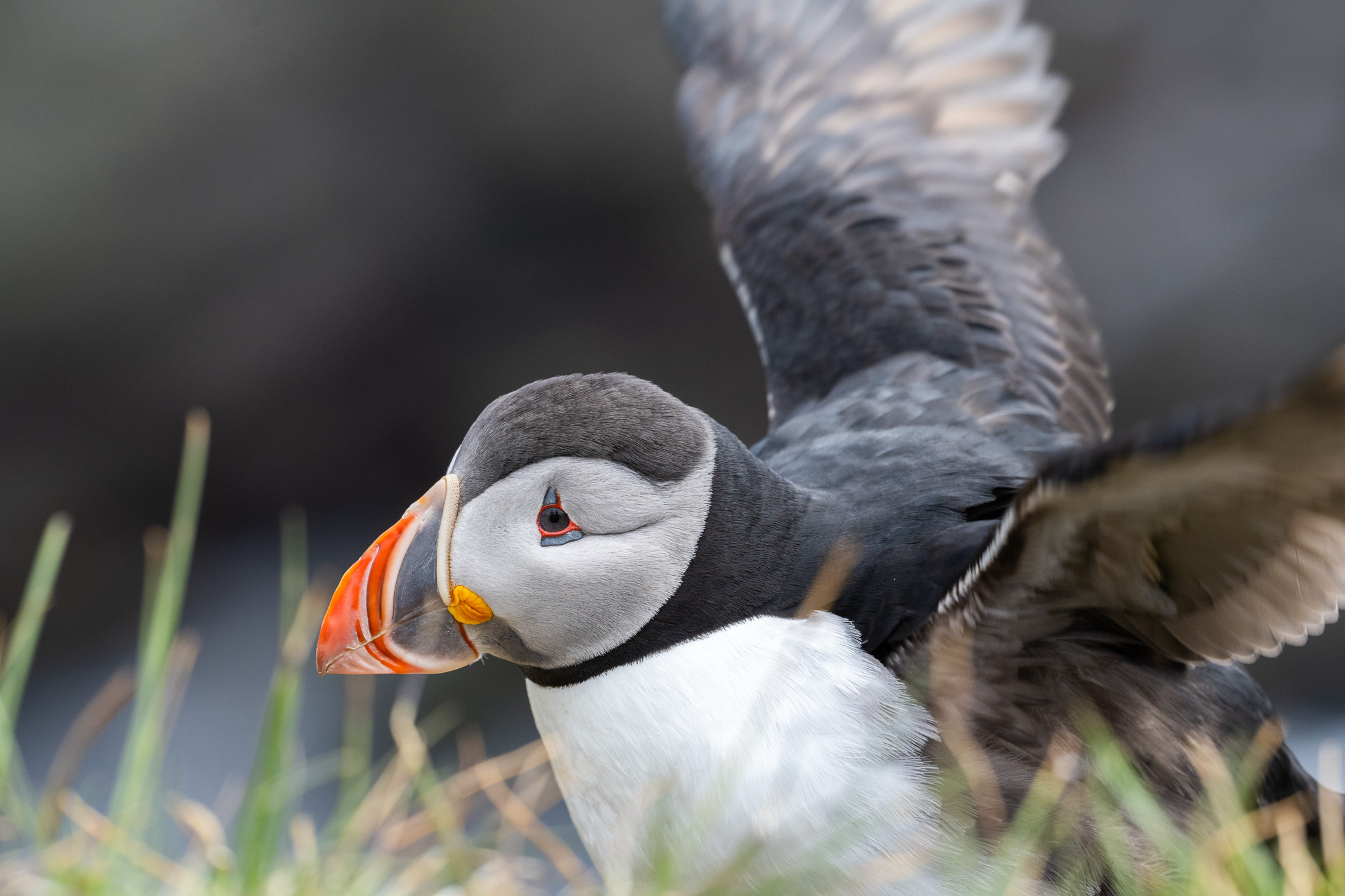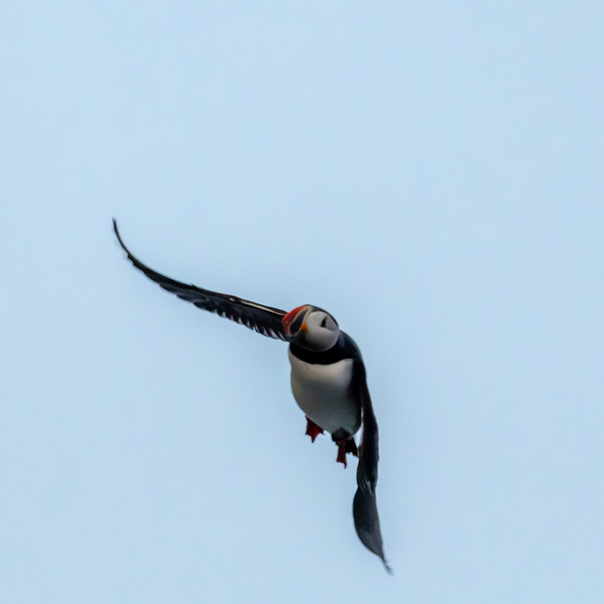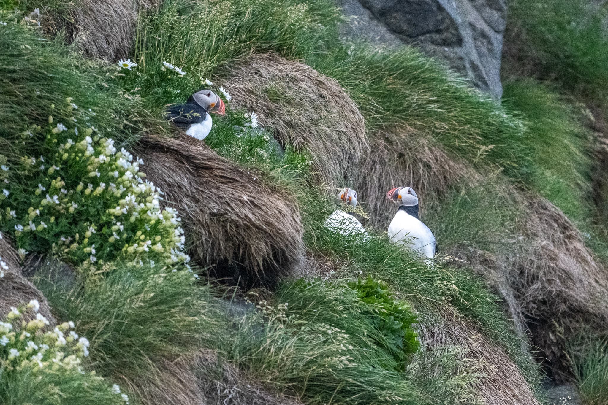 黑沙滩也是著名的Puffin栖息地,不过比起西峡湾地区,这里的Puffin离你很远而且大部分时间都在天上飞。由于追拍技术一般,再加上暗淡的光线让我不得不使用6400 iso才能勉强保证不糊,举着180-600大炮的我实在是很难拍到飞行的动态,几张凑合看吧……
